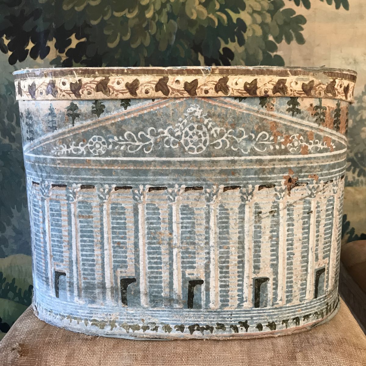 Fabulous large American hat box (much travelled as purchased in France!) a very beautiful example - gentle grey blue chinoiserie design paper covered card - in fair to good condition