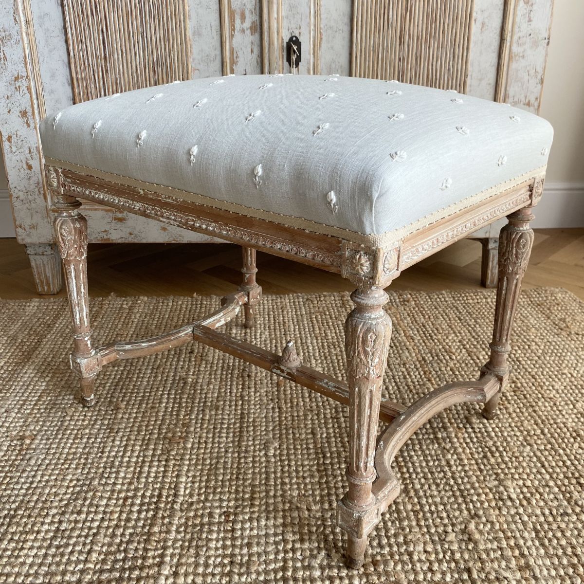 A large 19th century French stool with traces of original gilding reupholstered and covered in a hand embroidered linen (white and ecru flowers on a pale blue/grey background) strong and stable to use