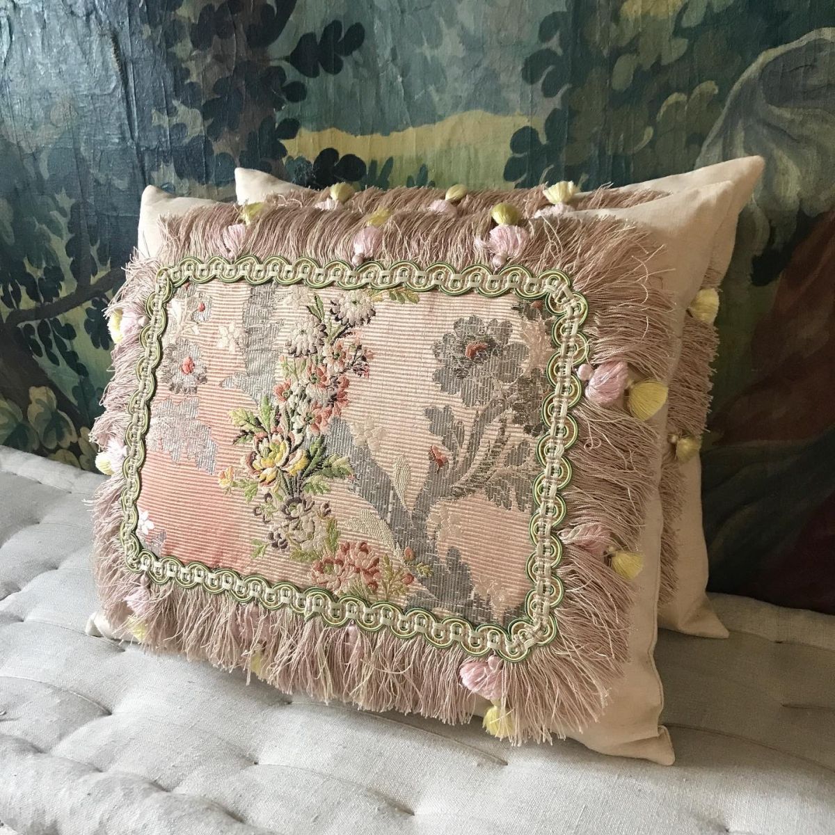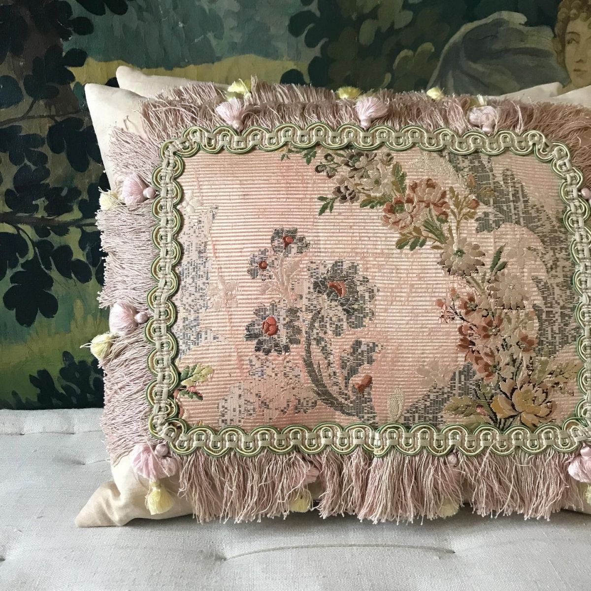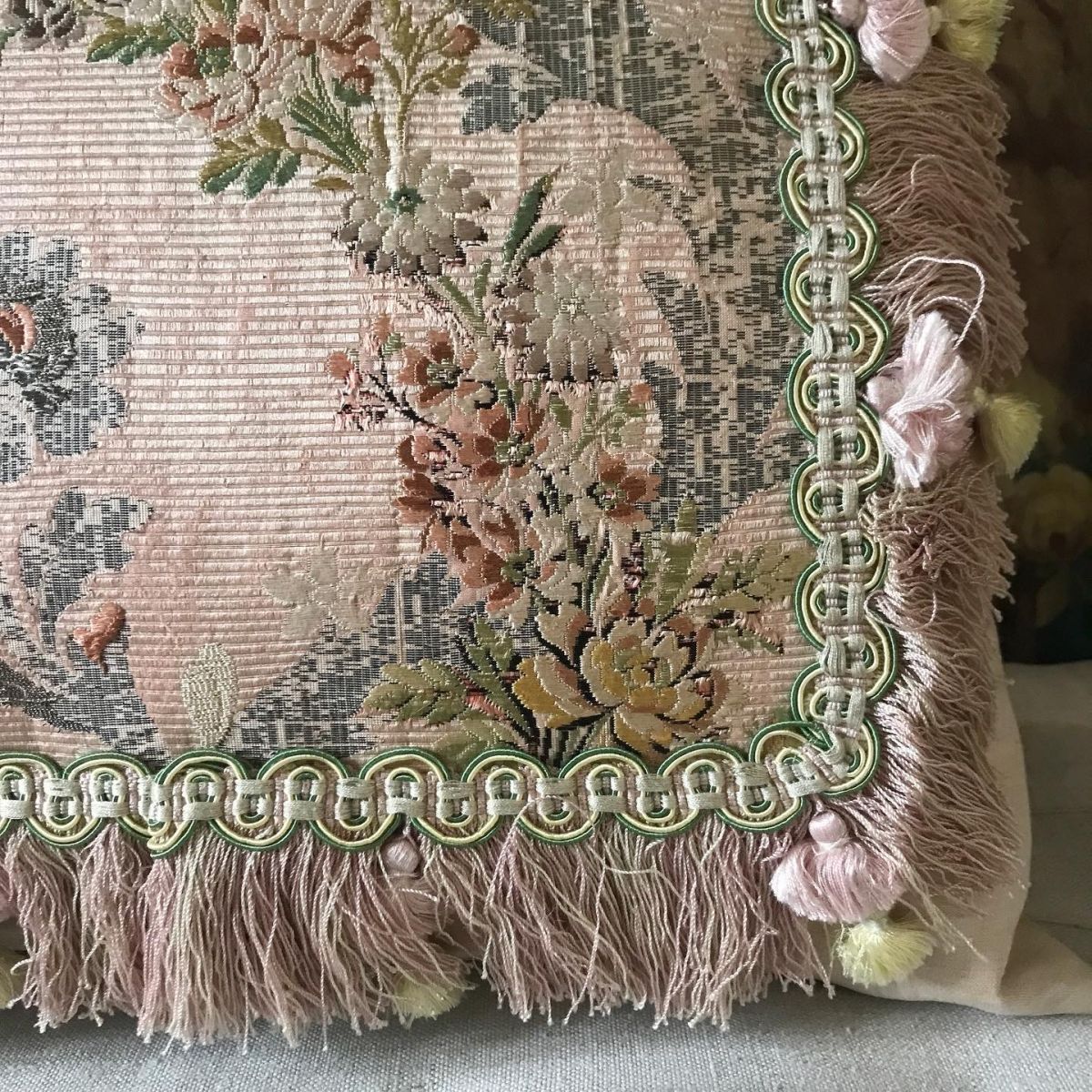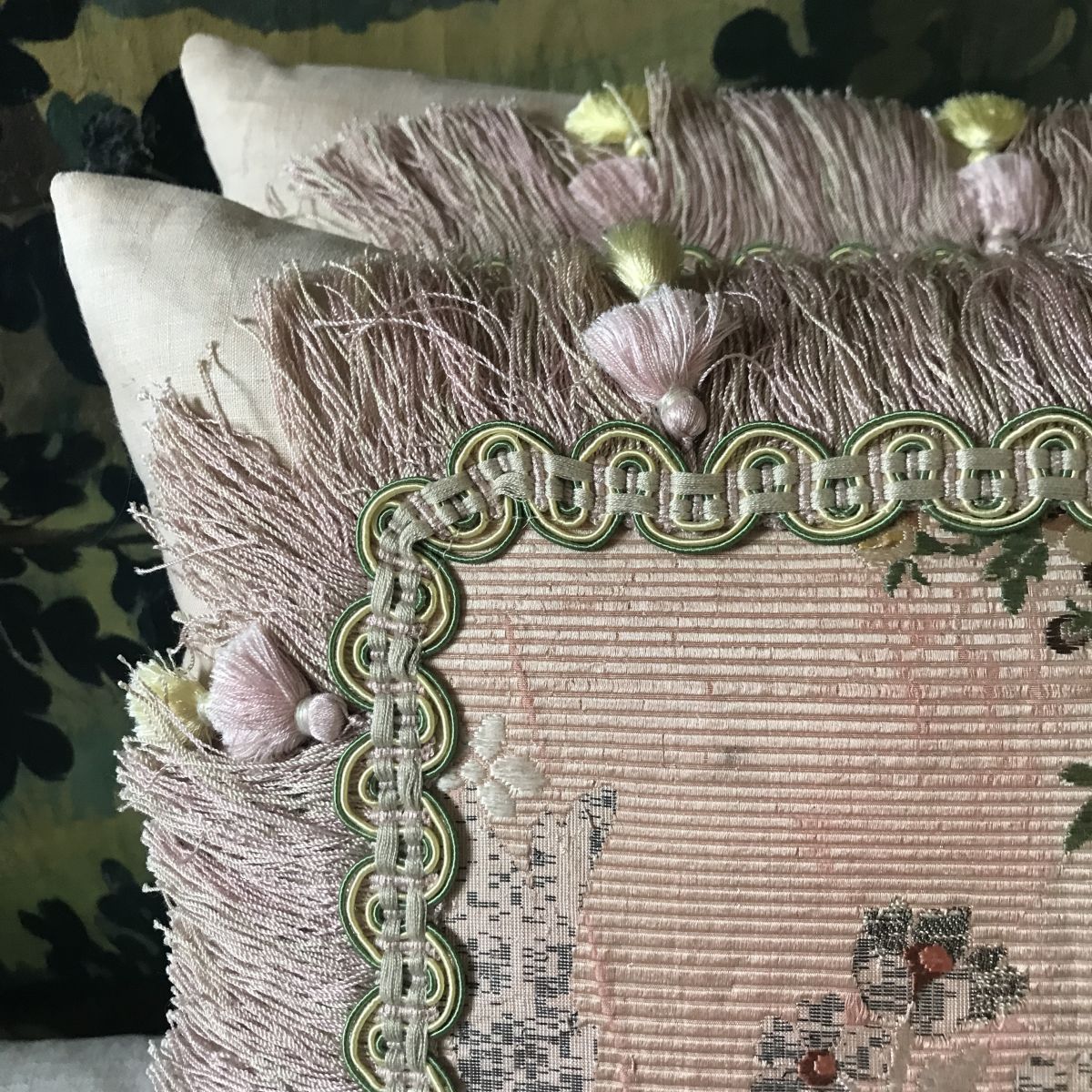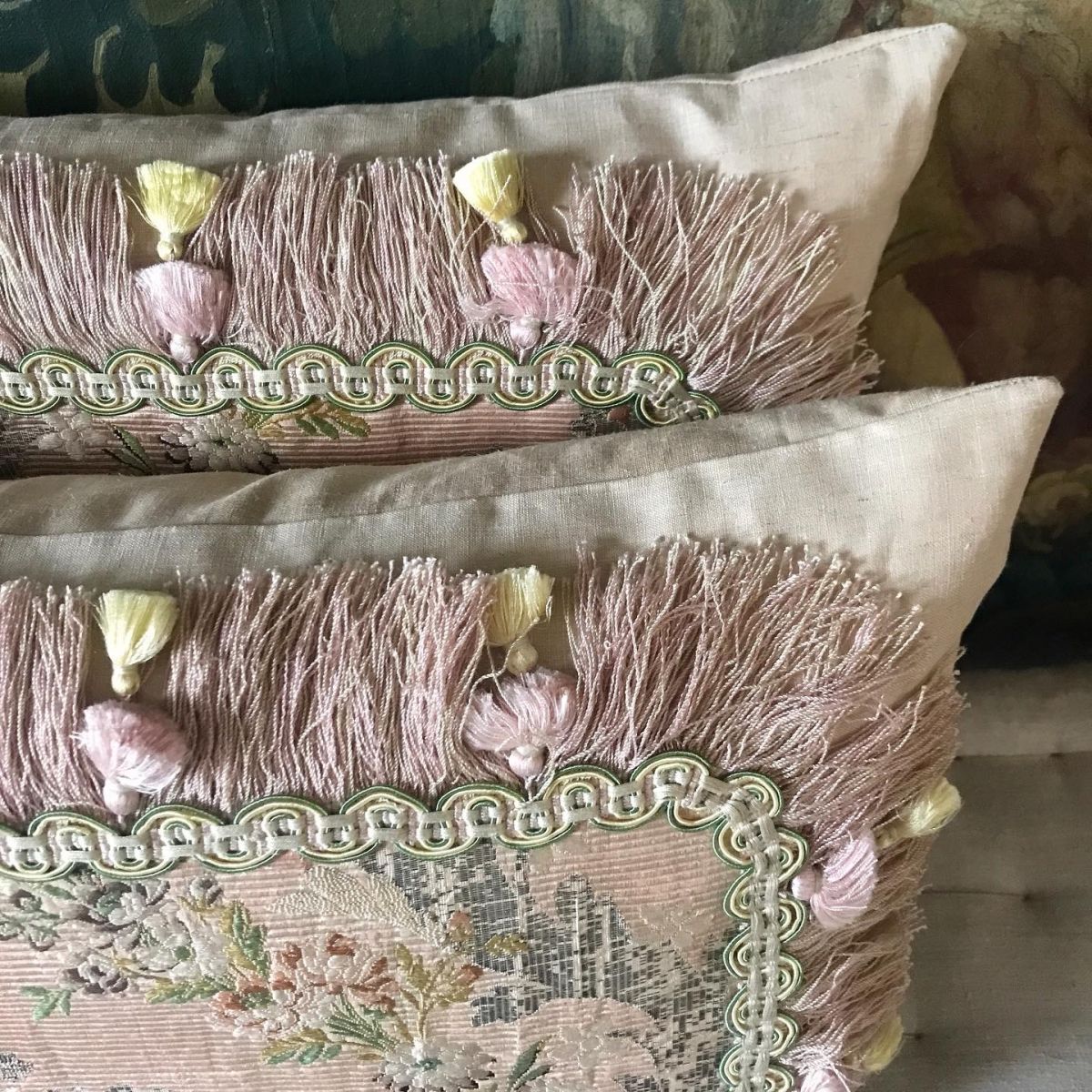 Beautiful cushions made from a large panel of exquisite Spitalfields silver thread silk brocade dating to circa 1800 then trimmed with a deep silk tassel fringe all placed on antique silk with matching antique silk to reverse - hand stitched to bottom with soft feather inner pads - textiles are all laundered and in excellent condition but given the early age of the silk these should be considered as dress cushions not for everyday sitting on
