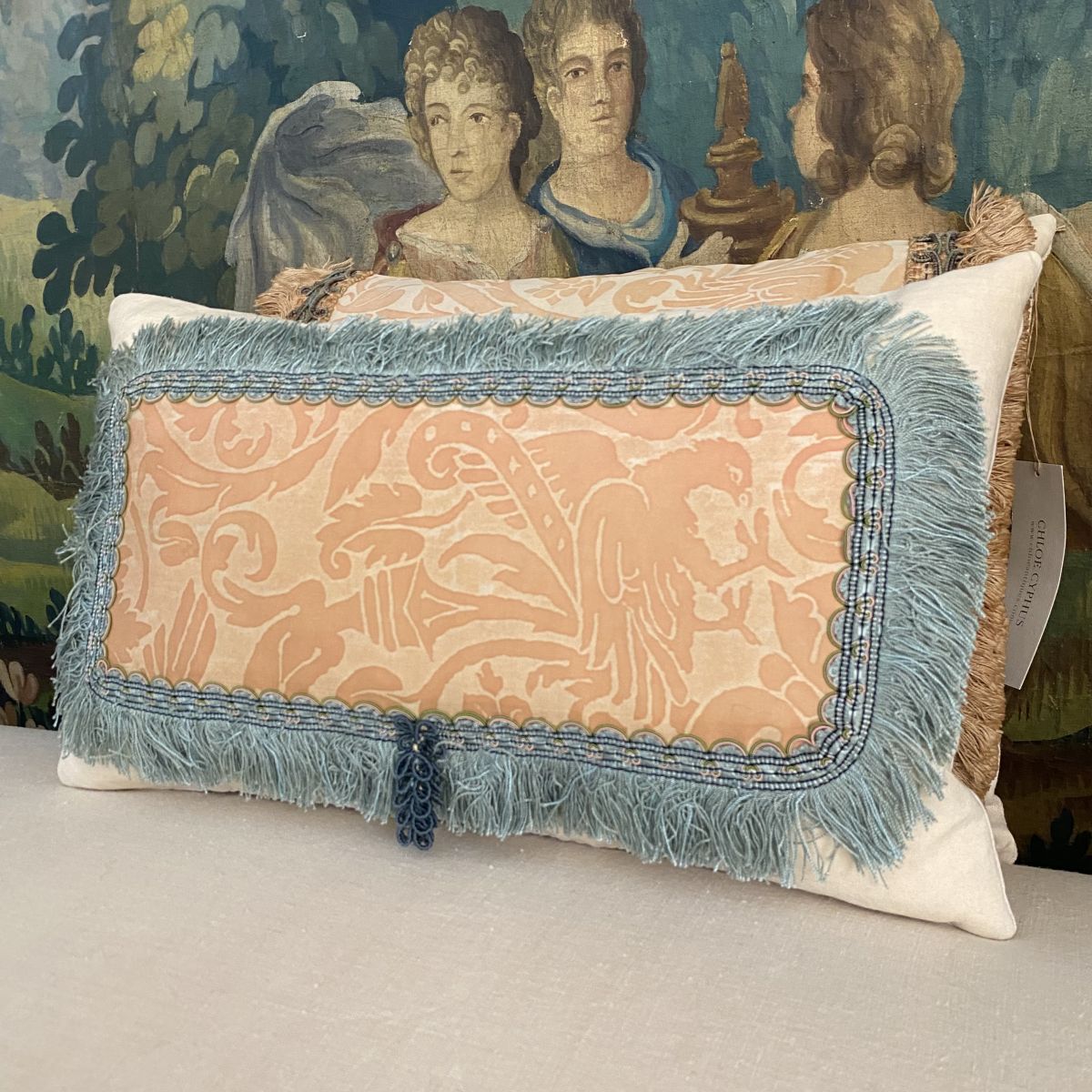 A panel of Fortuny Uccelli pattern in Melon edged with a blue vintage silk fringe on antique linen
