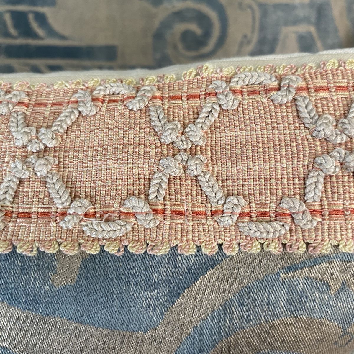 This one pictured is a large panel edged top and bottom with a pinky melon Claremont braid on antique linen - antique linen back - zipped