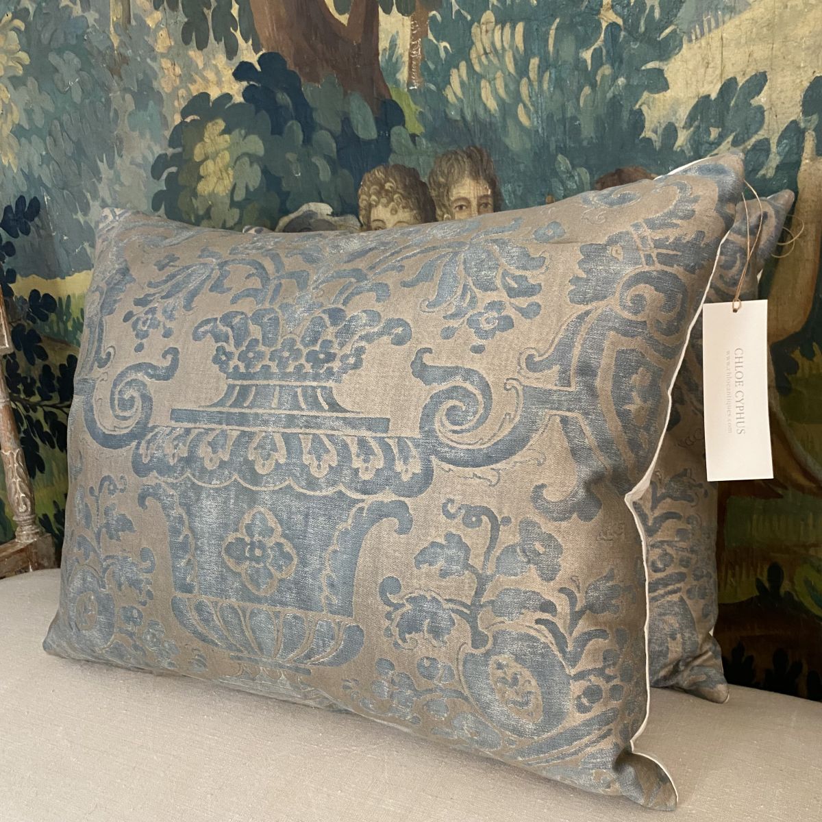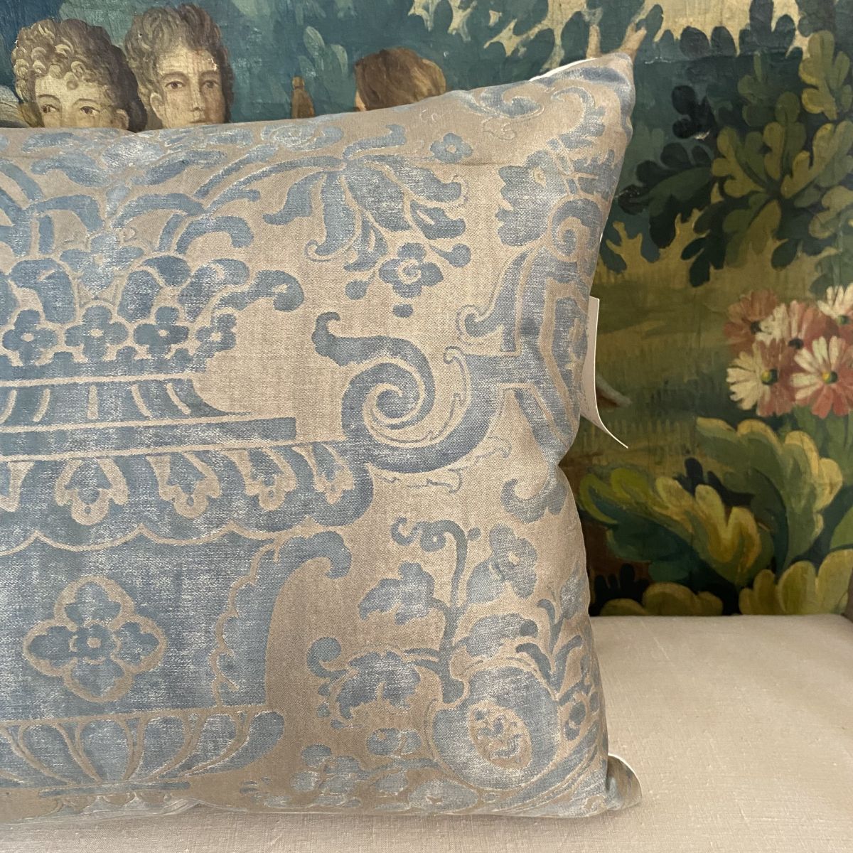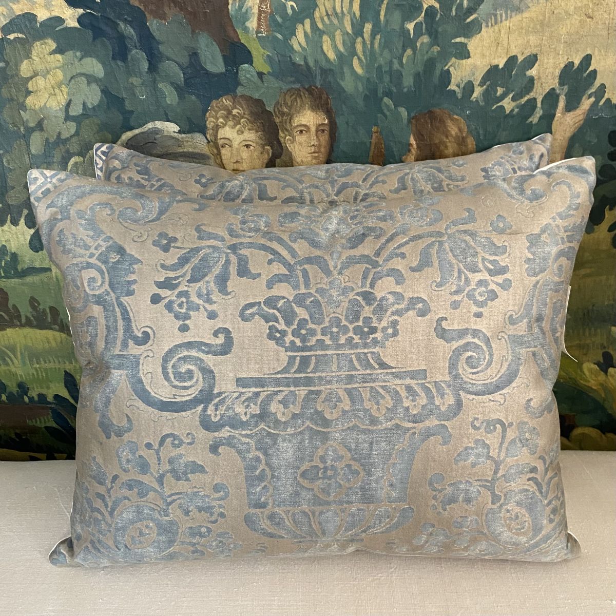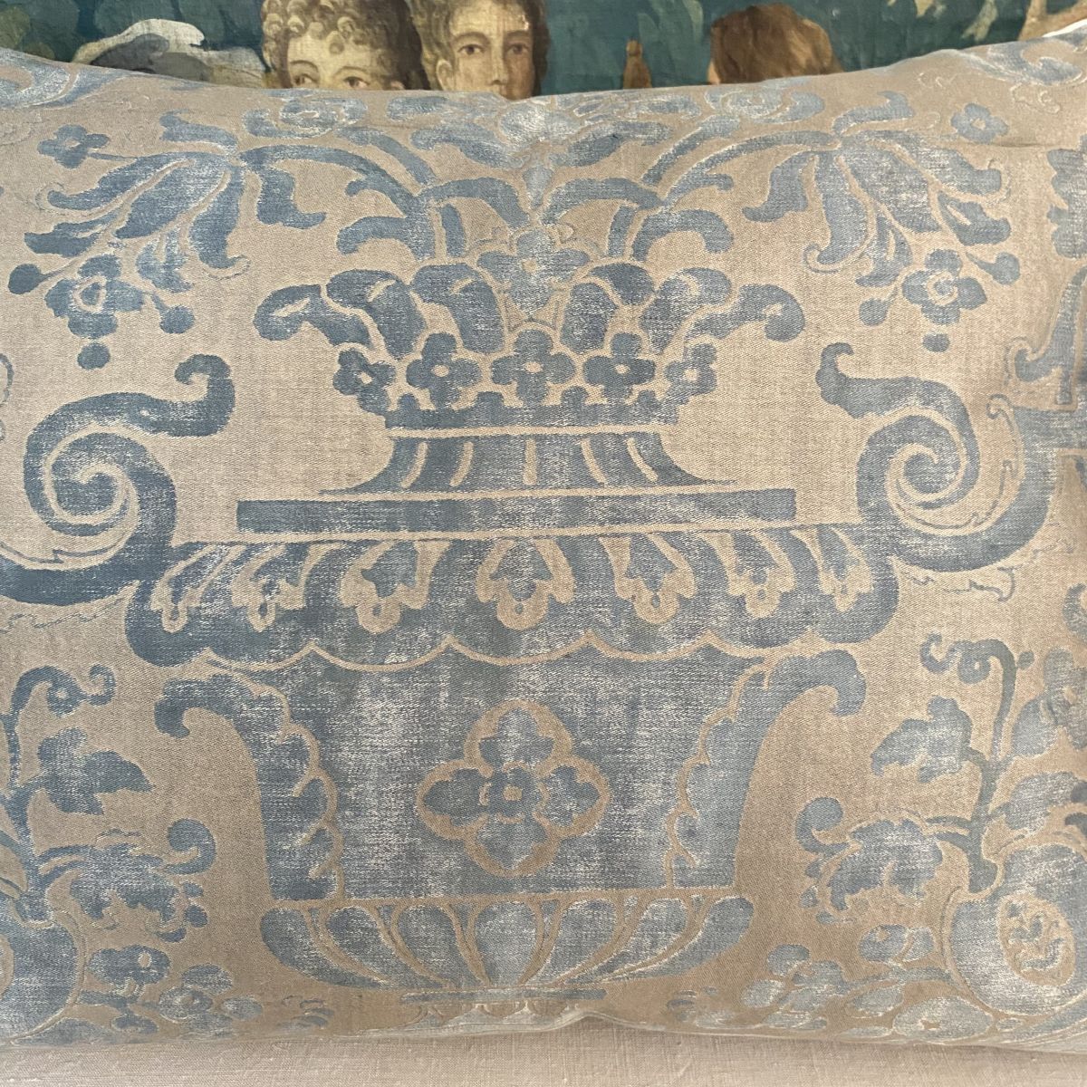 Fortuny Carnavalet Cushion - very large full width panel with design centred - simple plain design not piped or trimmed - front lined - antique linen back - zipped at bottom