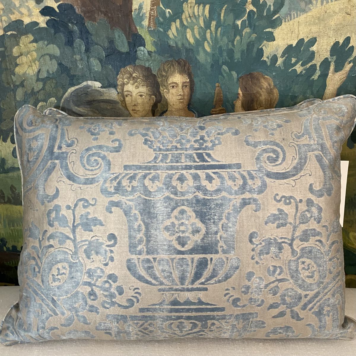 Fortuny Carnavalet Cushion - a very large cushion using the full width with pattern centred - narrow self piped - front lined - antique linen back - zipped at bottom