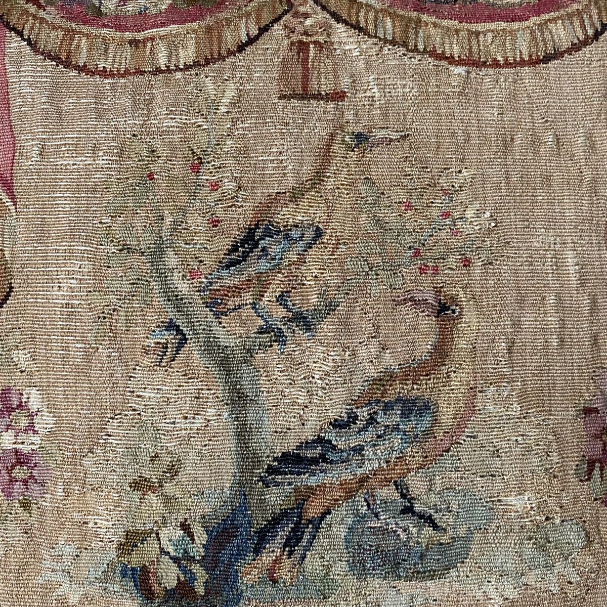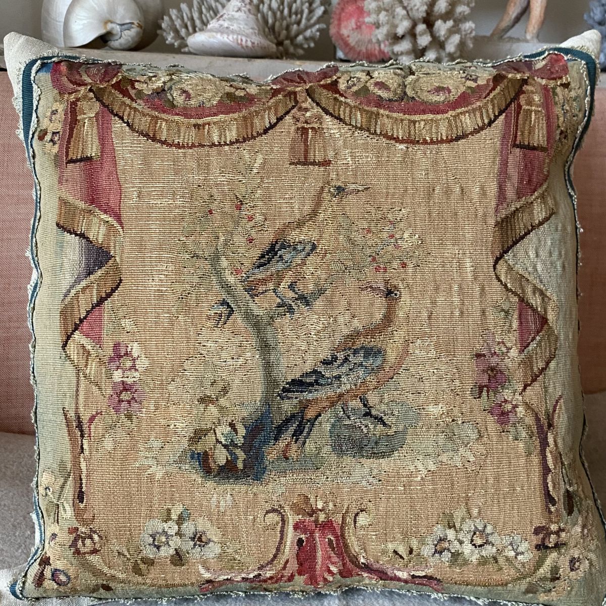 Beautiful large early 19th century French Aubusson panel - finely stitched birds and florals within a ribboned frame - age related wear (not restored) placed on antique hemp linen in a honey colour with the same linen to reverse - trimmed with a Claremont braid - hand stitched closed at bottom - plump luxurious down feather pad
