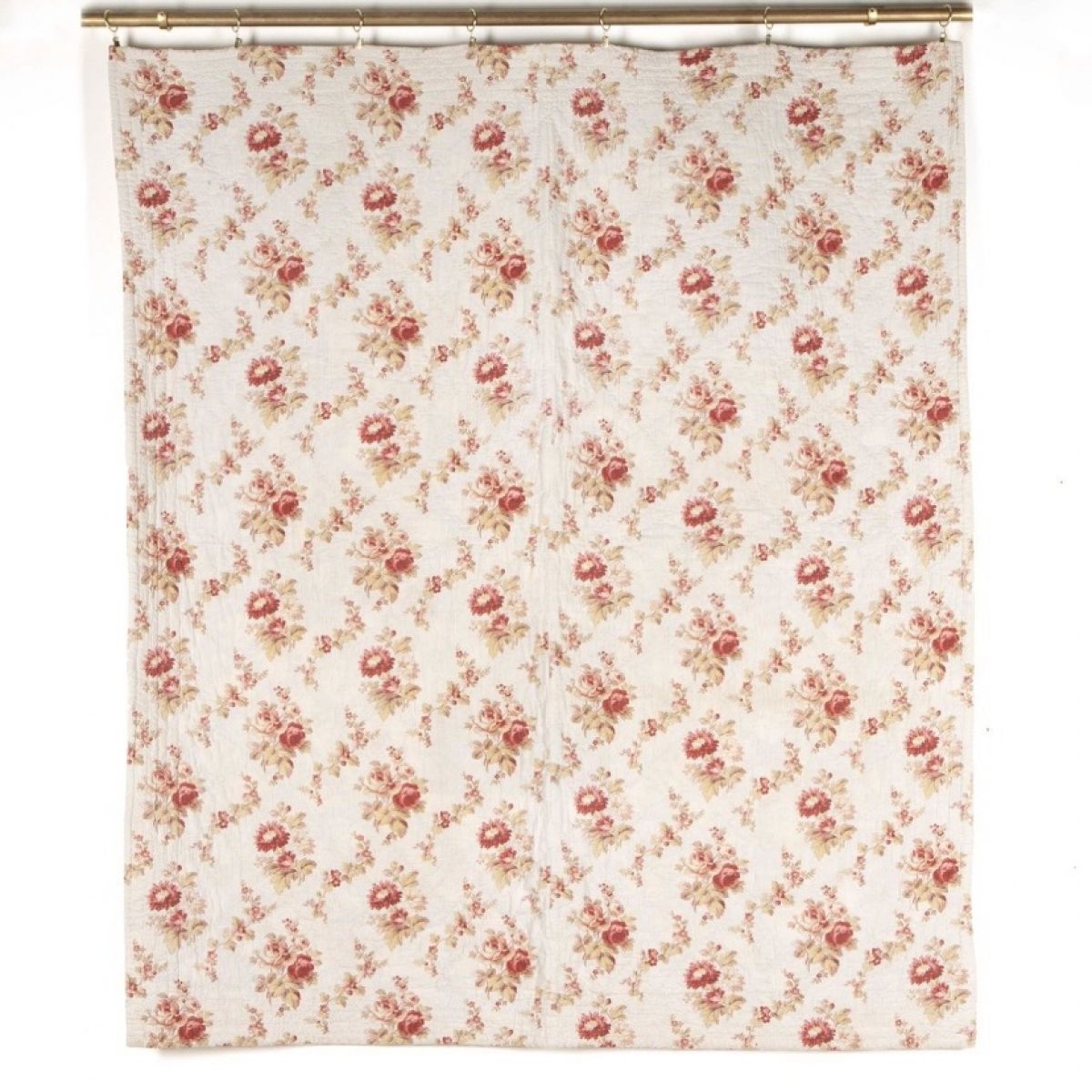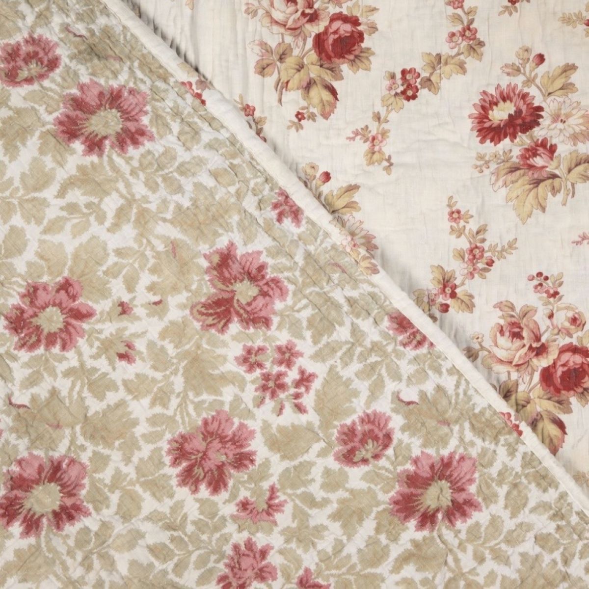 Pretty 19th century French hand stitched floral quilt with pink and raspberry roses on a pale cream background in good condition with a different pretty floral to reverse