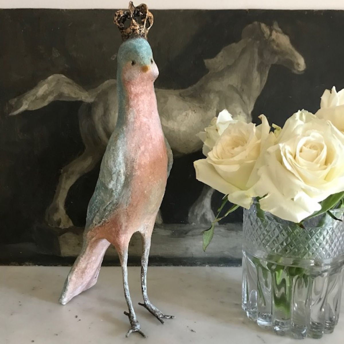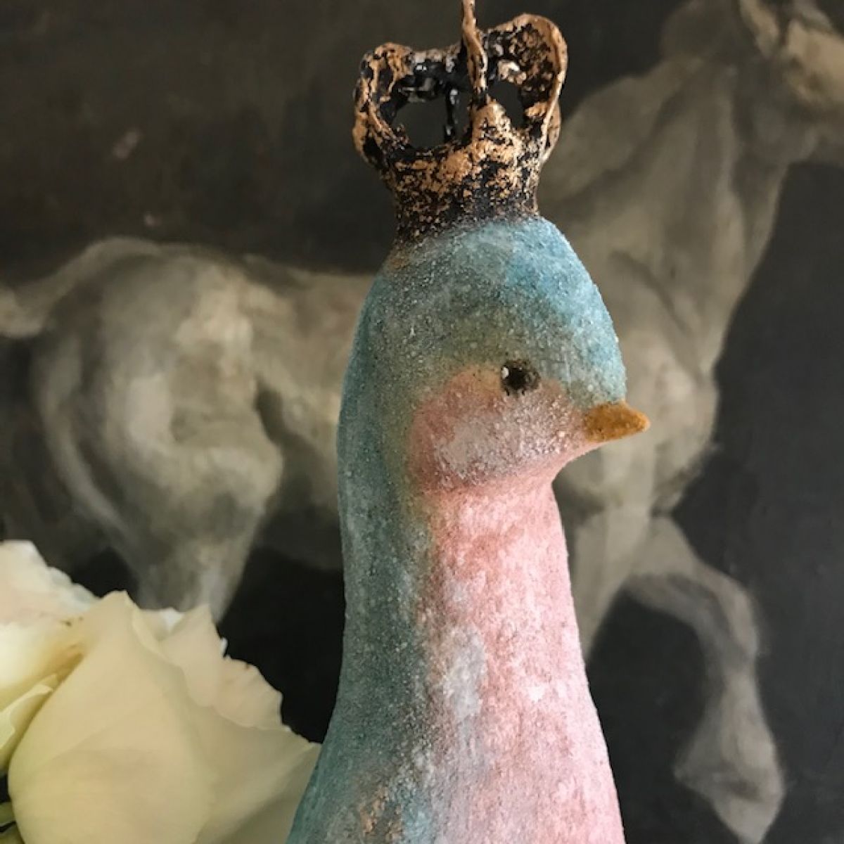 A hand made and painted papier-mâché bird - each bird is slightly different - with or without crowns and they vary in colour and size - height varies from 8" to 10"