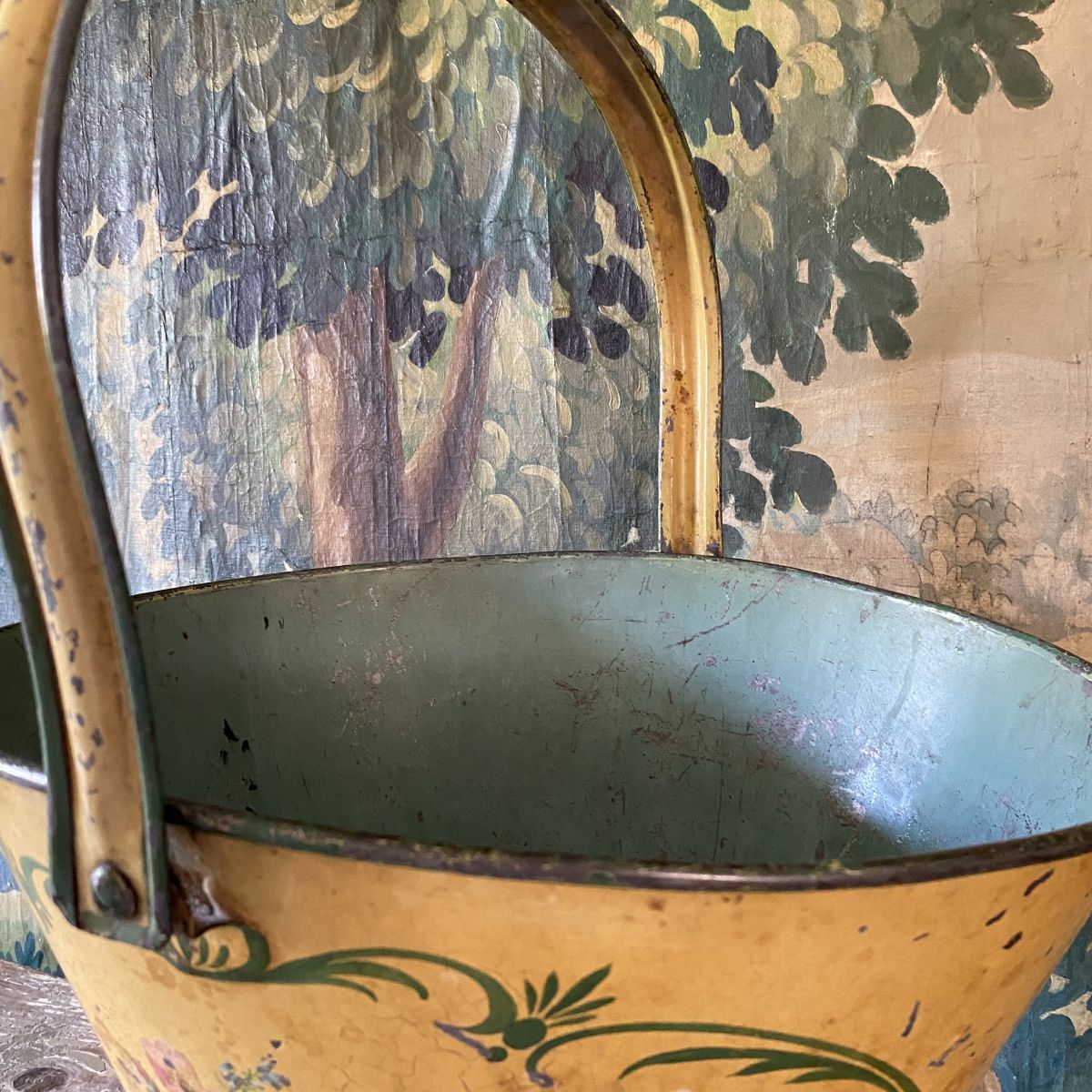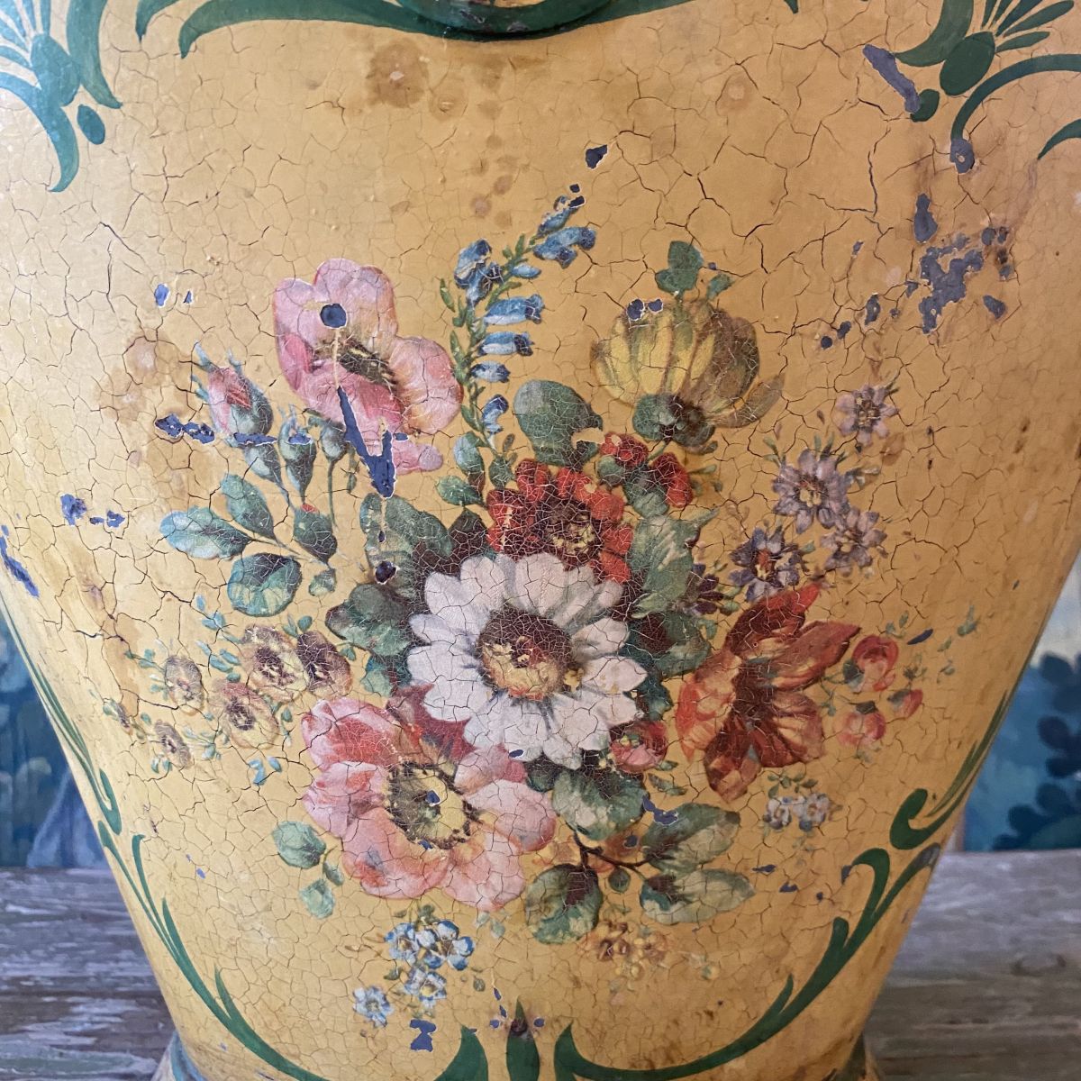 A large very beautiful hand painted tole flower basket with floral decoration on both sides on a soft yellow background with plain blue interior (which shows in the last photo)