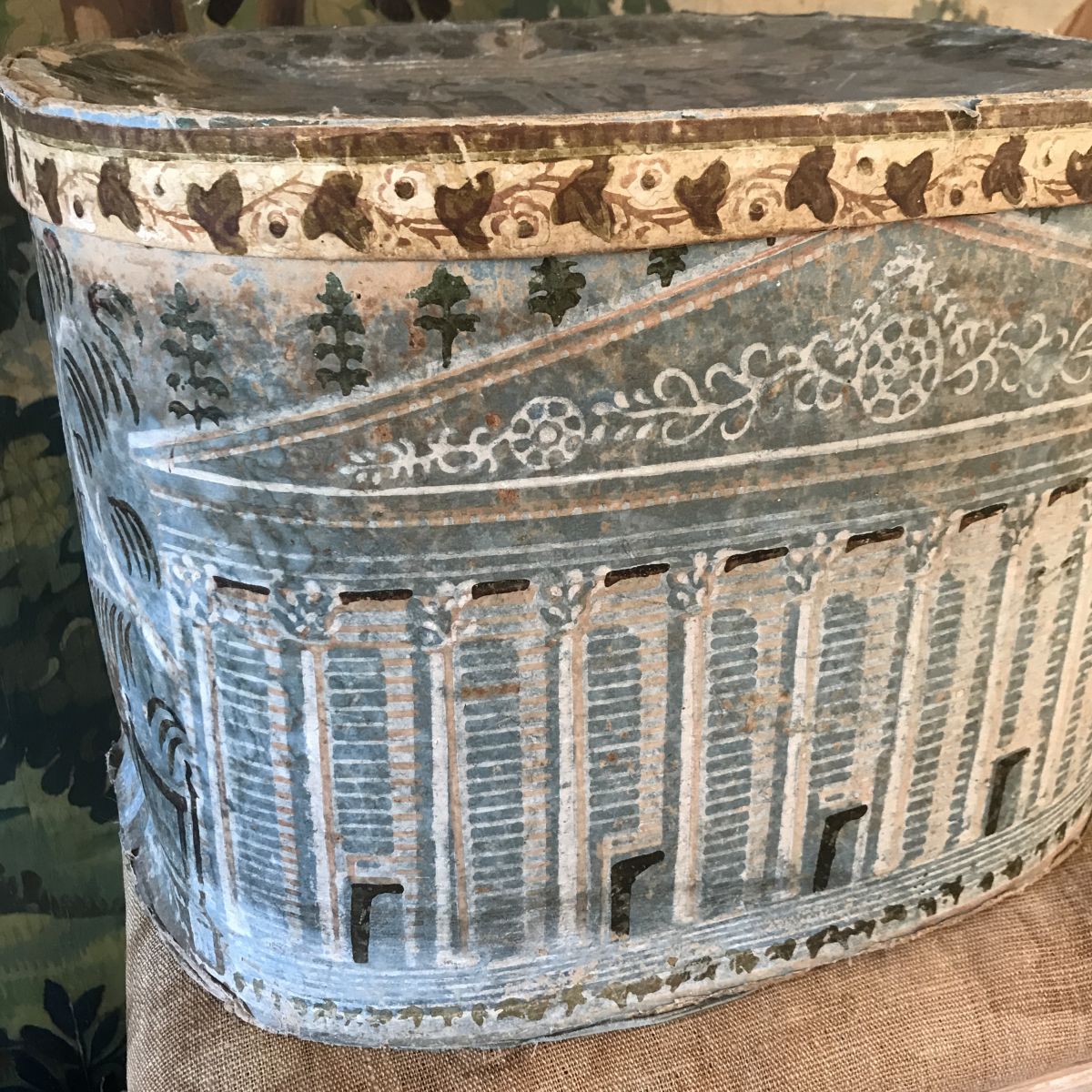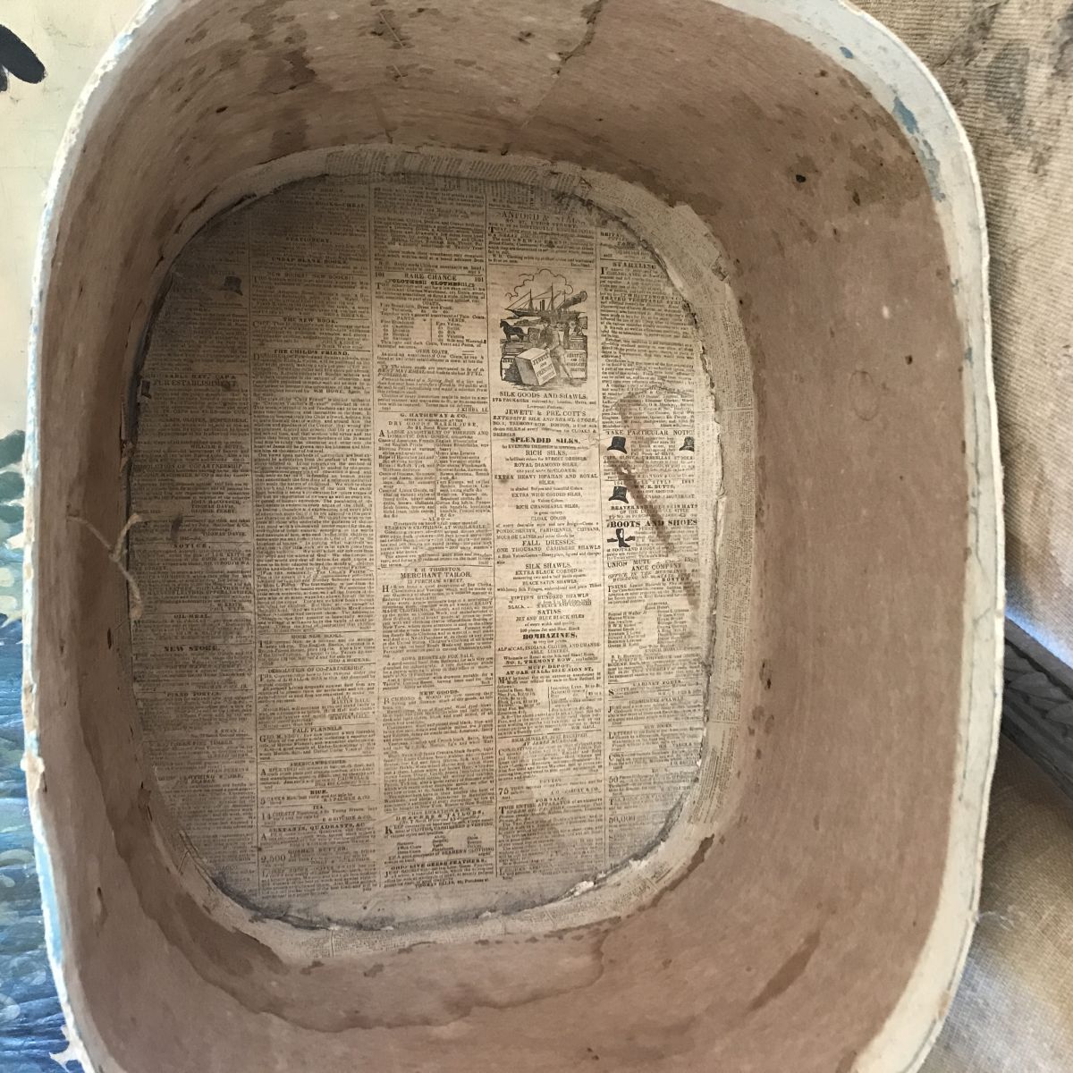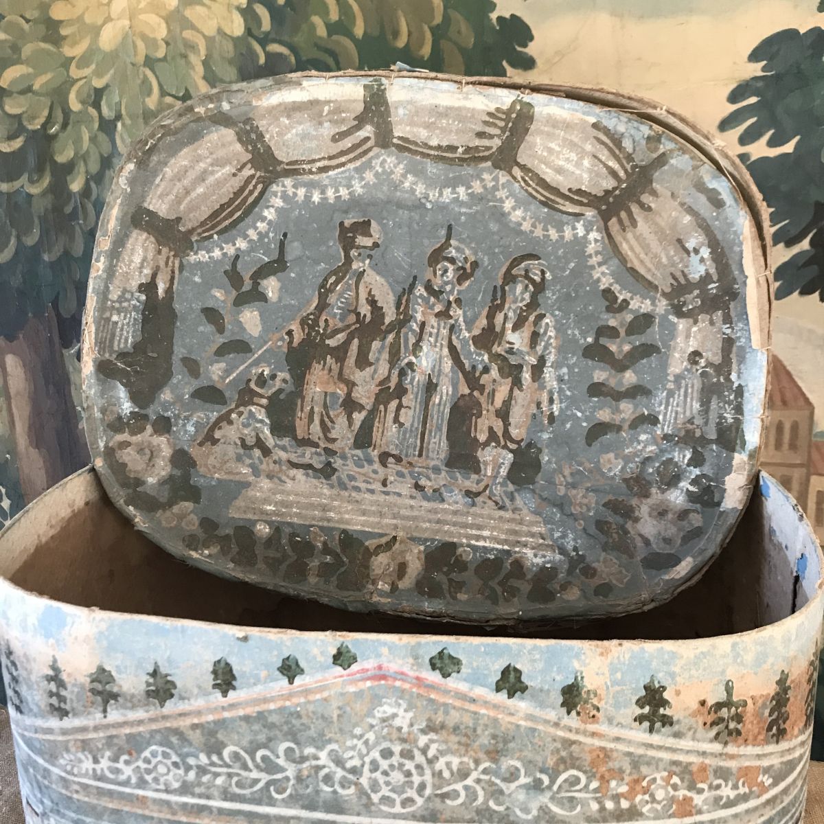 Fabulous large American hat box (much travelled as purchased in France!) a very beautiful example - gentle grey blue chinoiserie design paper covered card - in fair to good condition
