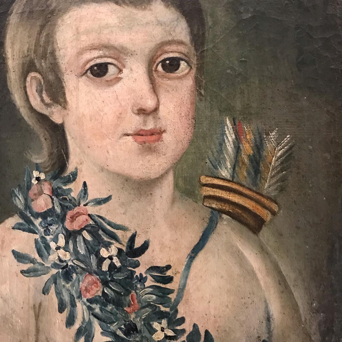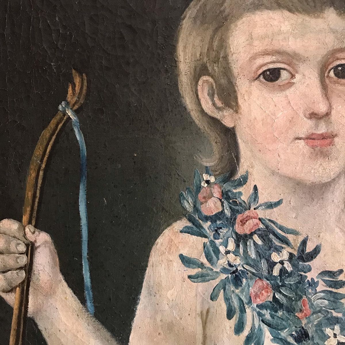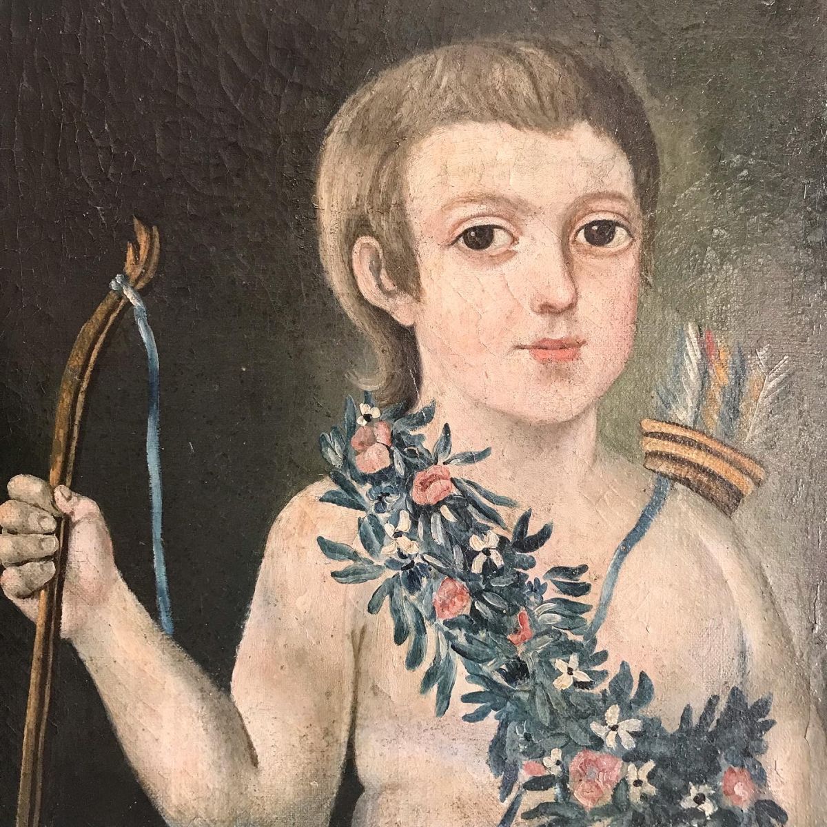 A most charming late 18th century painting - oil on canvas - in the most gorgeous colours it depicts a young Cupid - in Greek mythology Cupid was the God of love - son of Mercury winged messenger to the gods and Venus the goddess of love - the unframed painting has been revarnished it does not appear to have been relined all in good condition