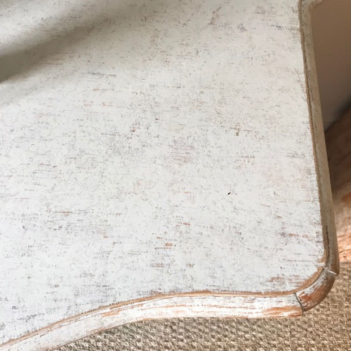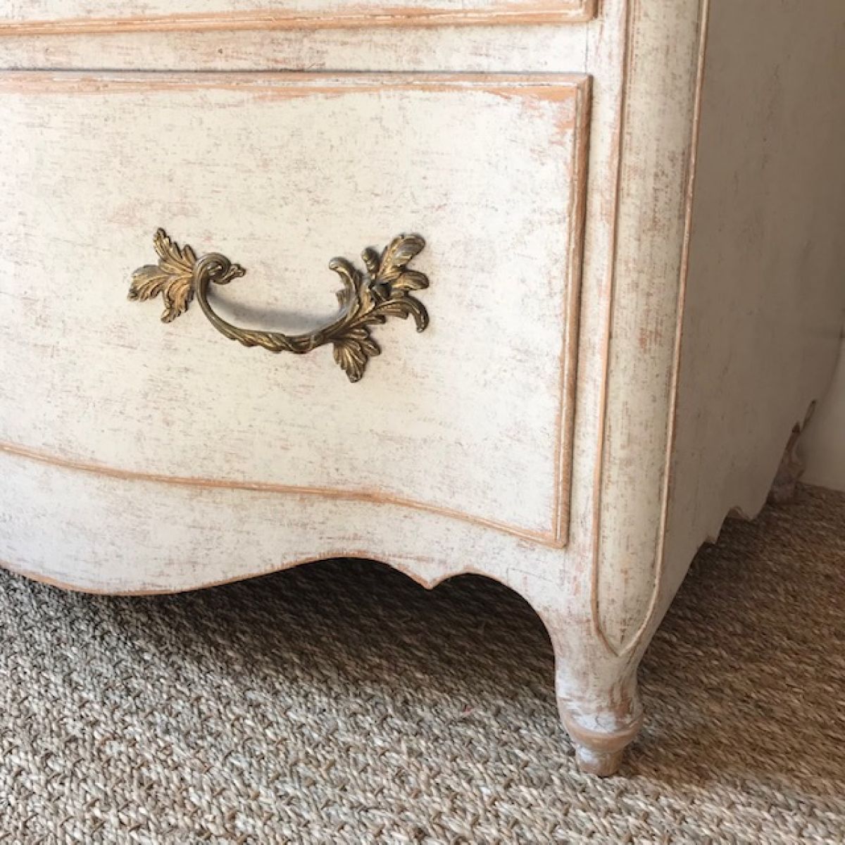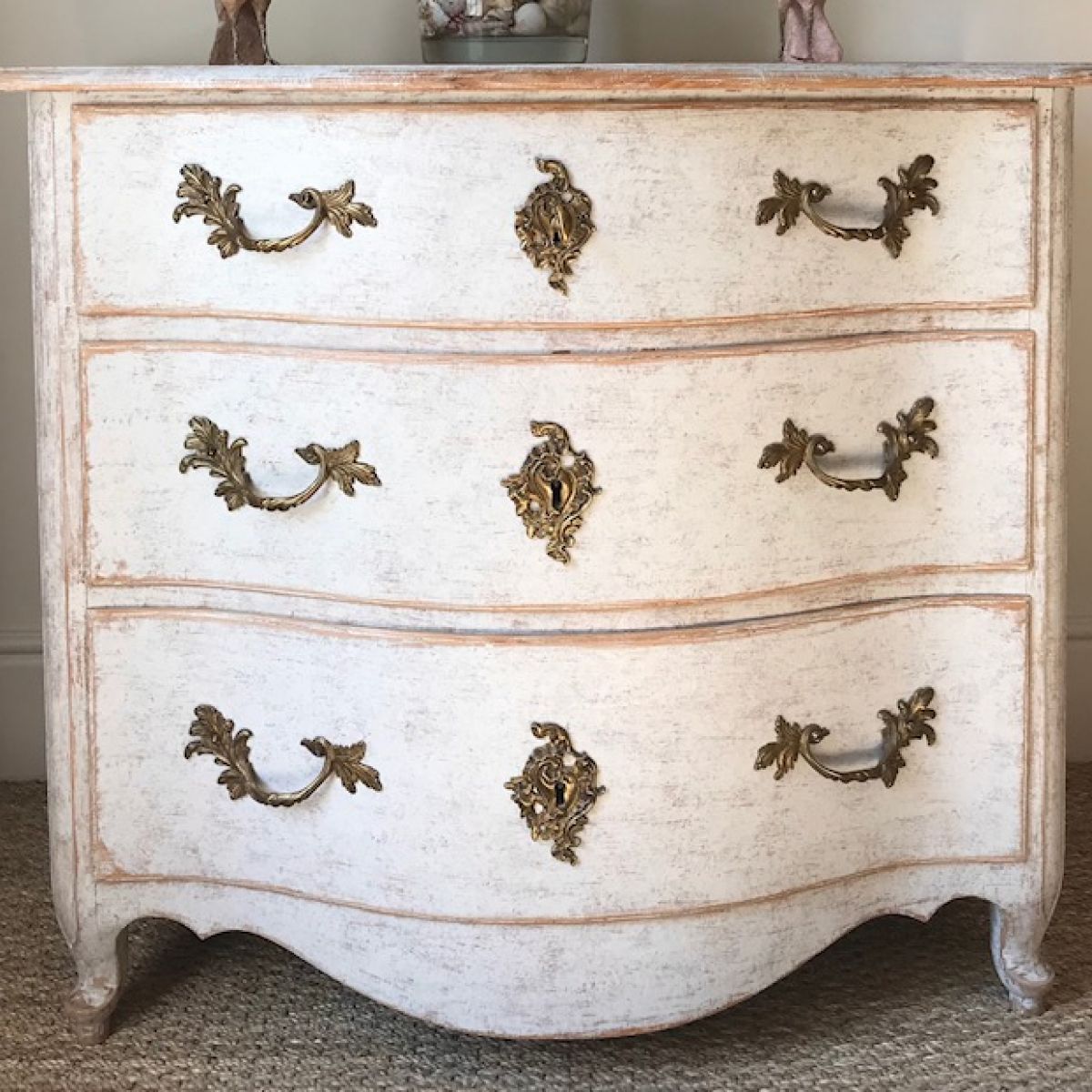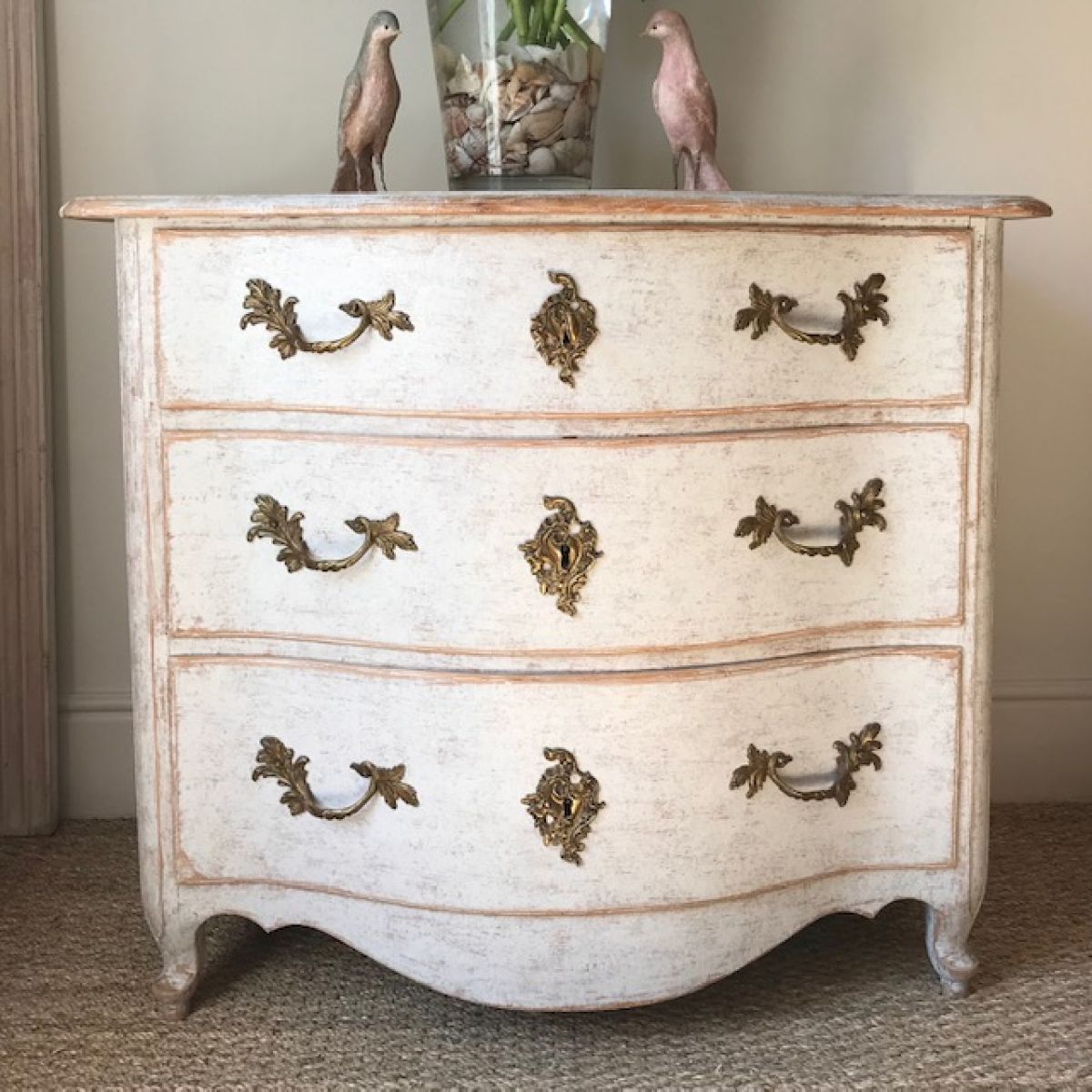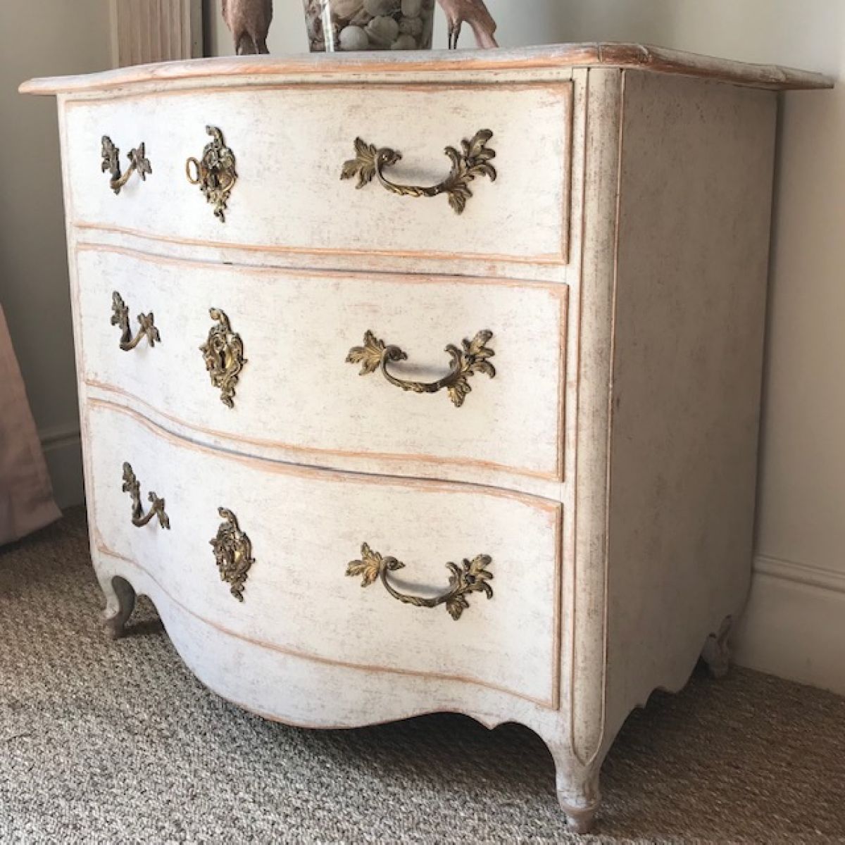 A charming 19th century bow front Swedish chest of drawers in very good condition - lots of lovely detail - it has a shaped top and shaped apron to the front and sids - repainted in palest grey (almost off white)