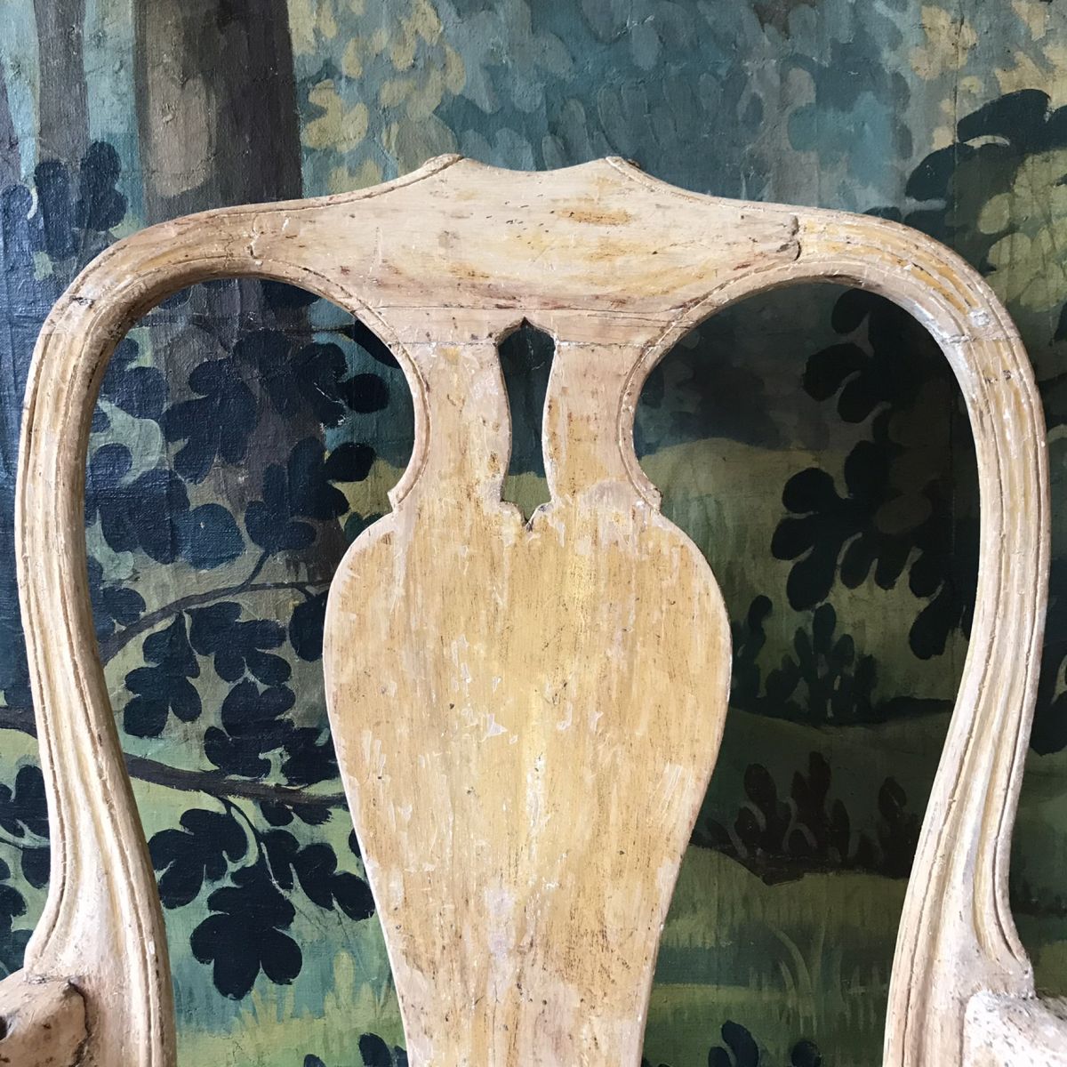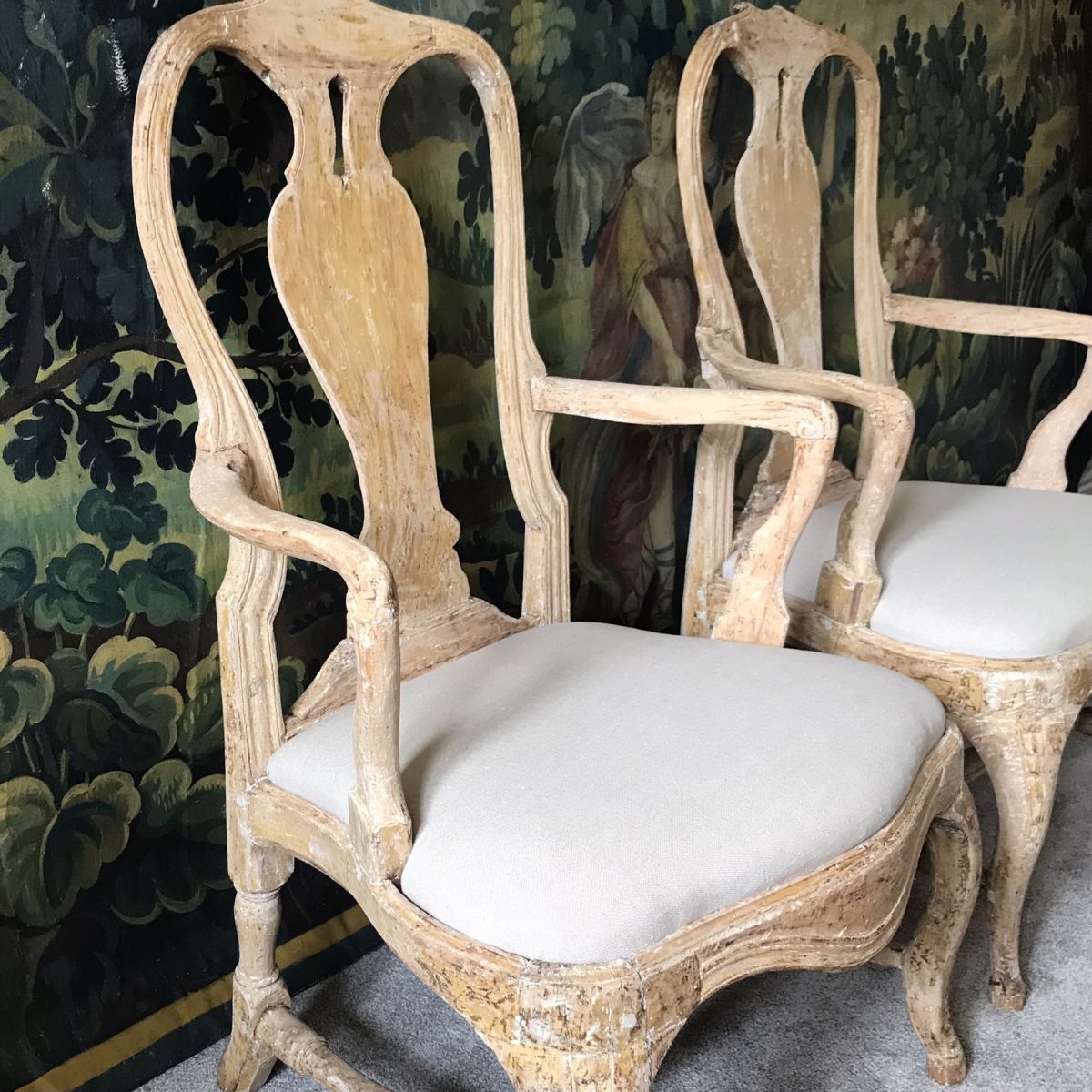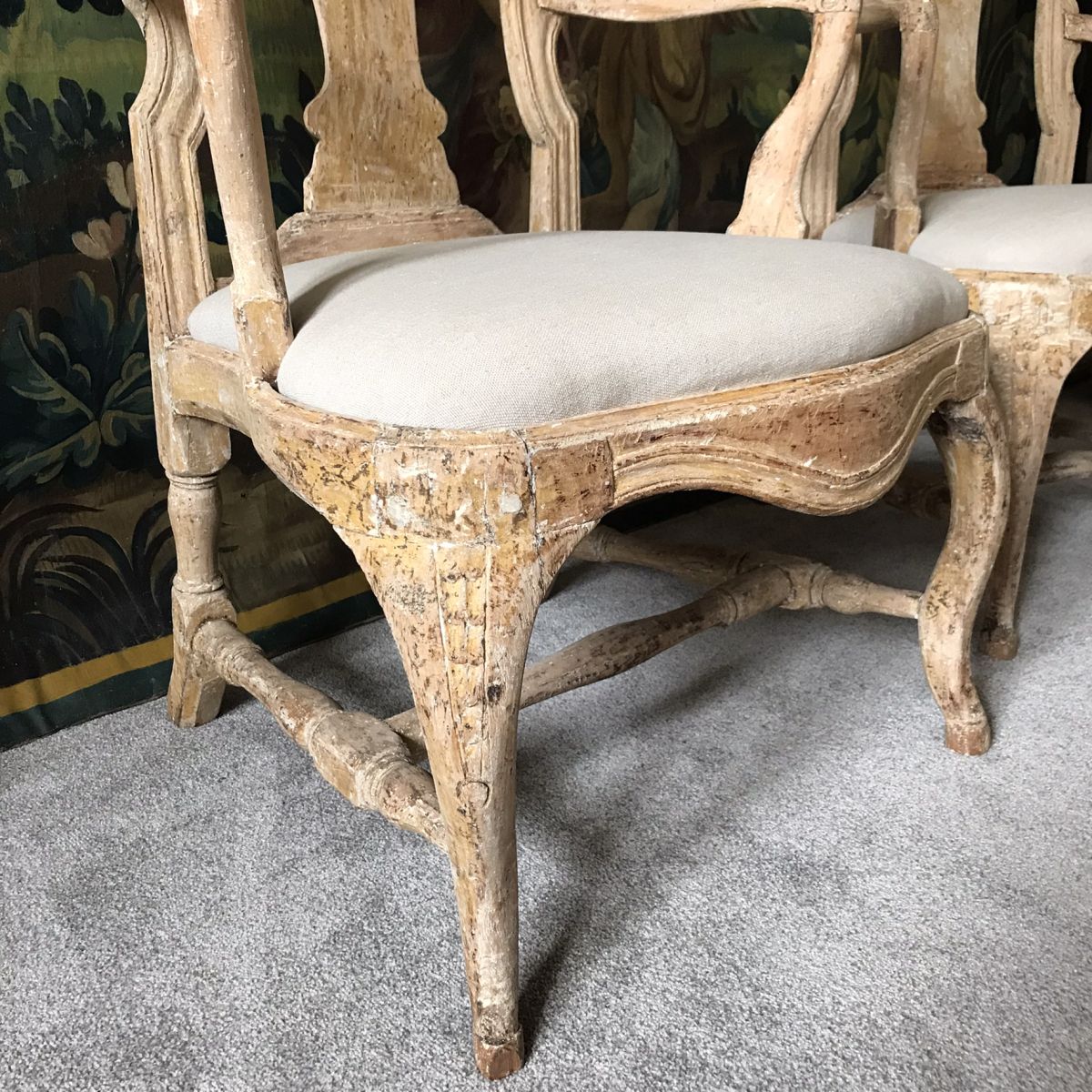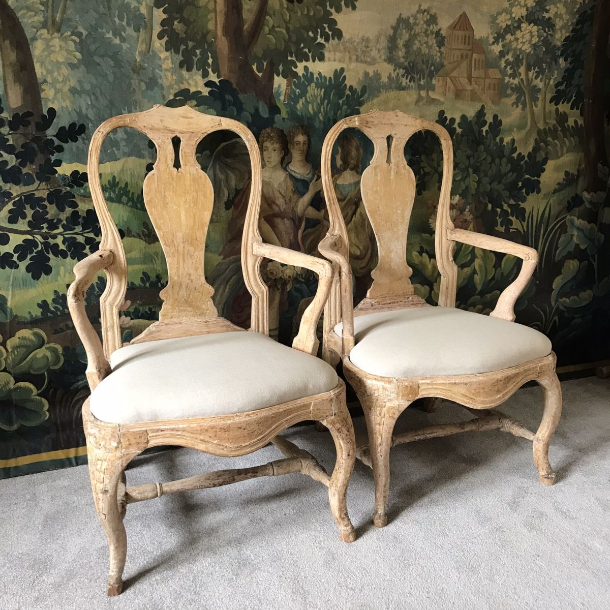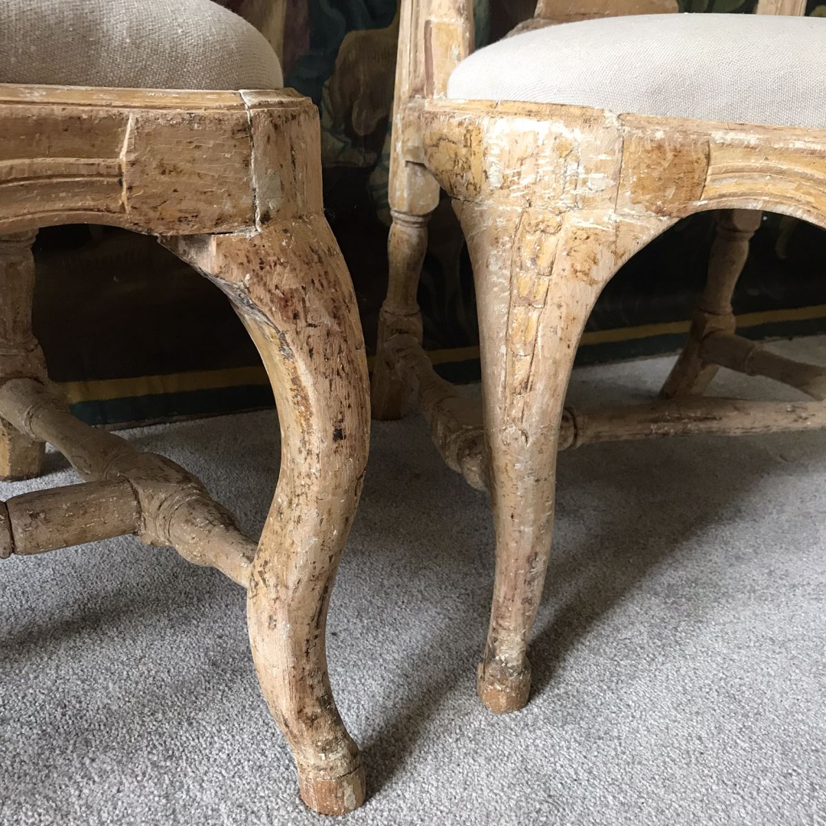 A superb pair of 18th century Swedish period rococo chairs in original paint in a glorious colour (not retouched) with hand carved details they are slightly smaller than average - this pair of chairs are hand carved and because of this vary fractionally in size - drop in seats have been simply recovered in plain linen - offered in very good condition they are utterly charming in my opinion