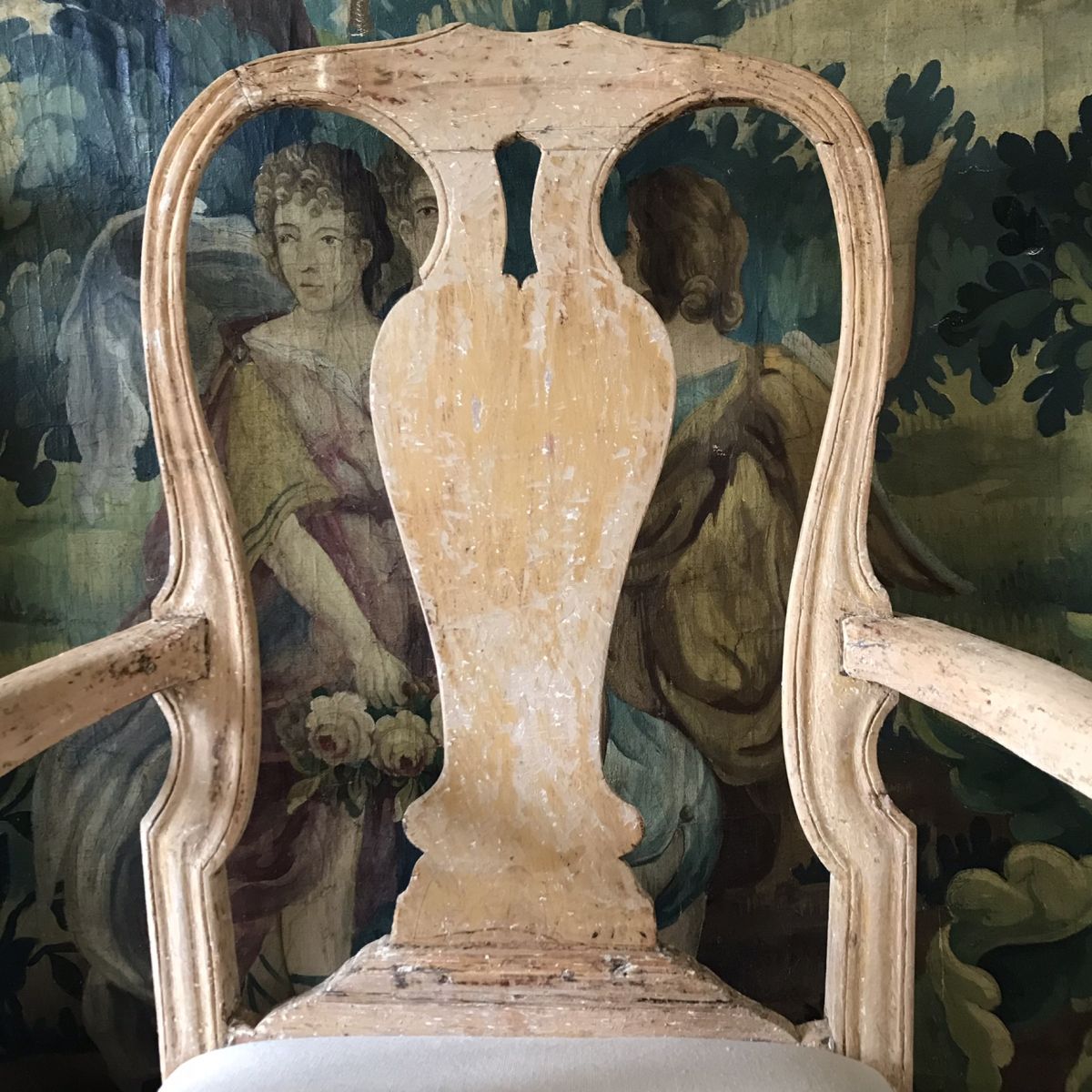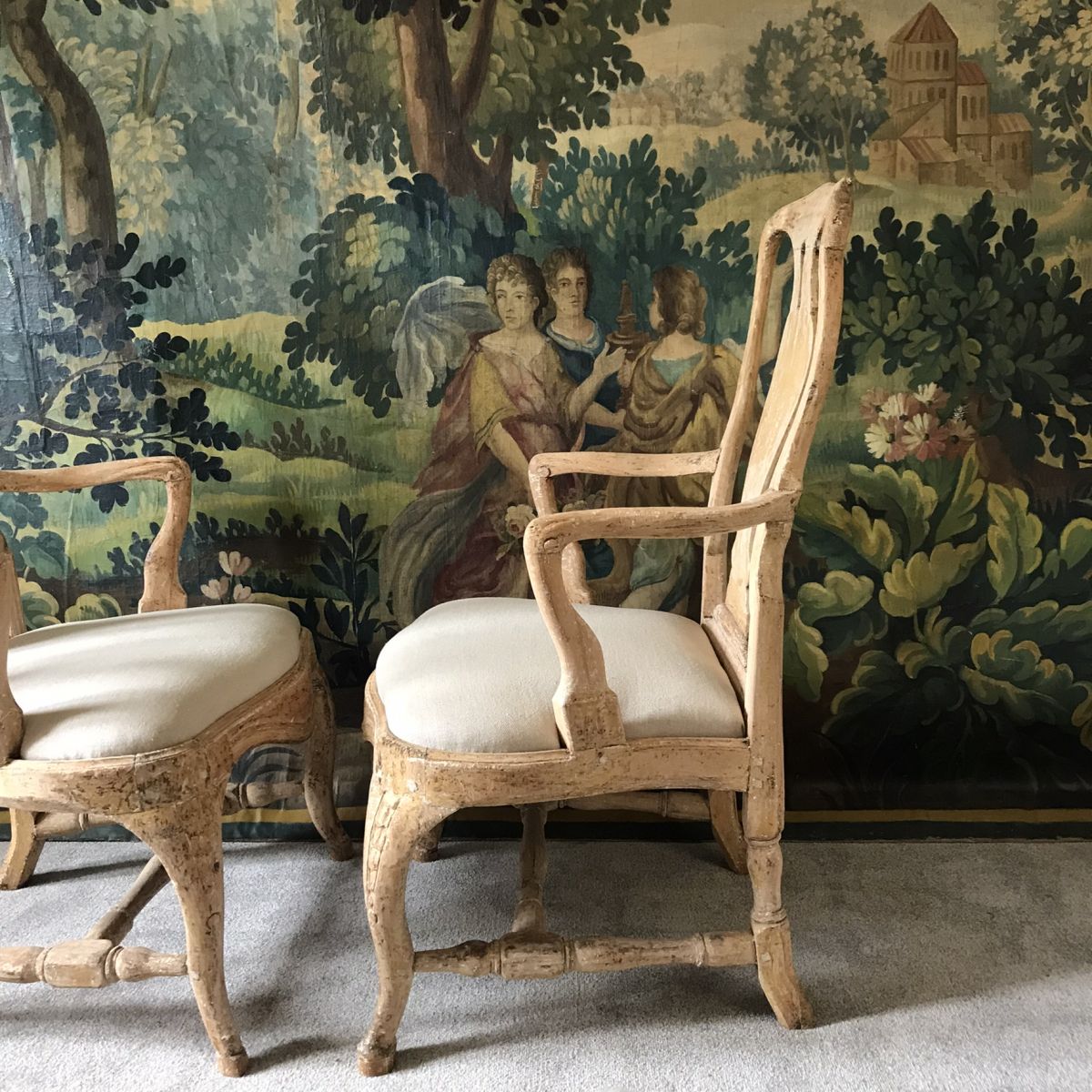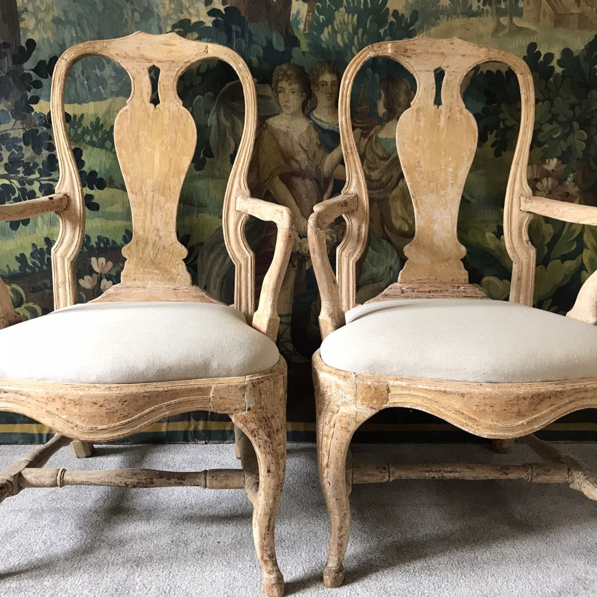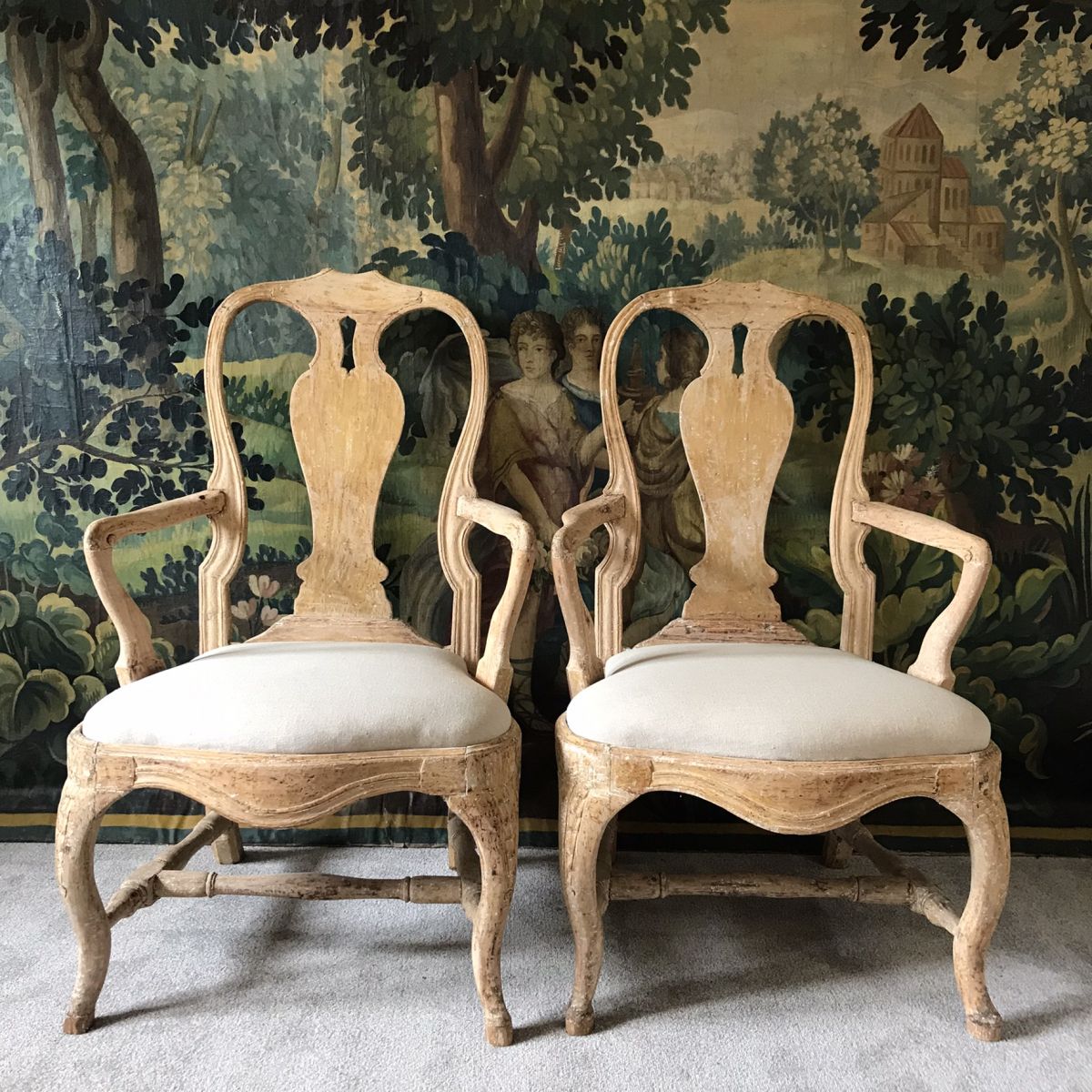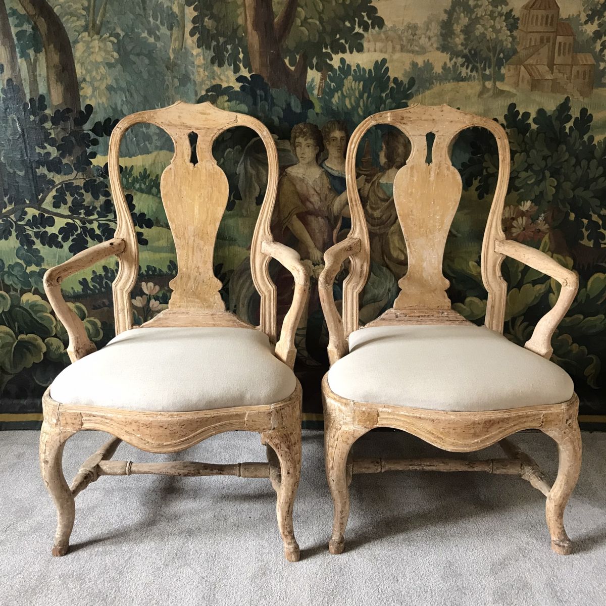 A superb pair of 18th century Swedish period rococo chairs in original paint in a glorious colour (not retouched) with hand carved details they are slightly smaller than average - this pair of chairs are hand carved and because of this vary fractionally in size - drop in seats have been simply recovered in plain linen - offered in very good condition they are utterly charming in my opinion