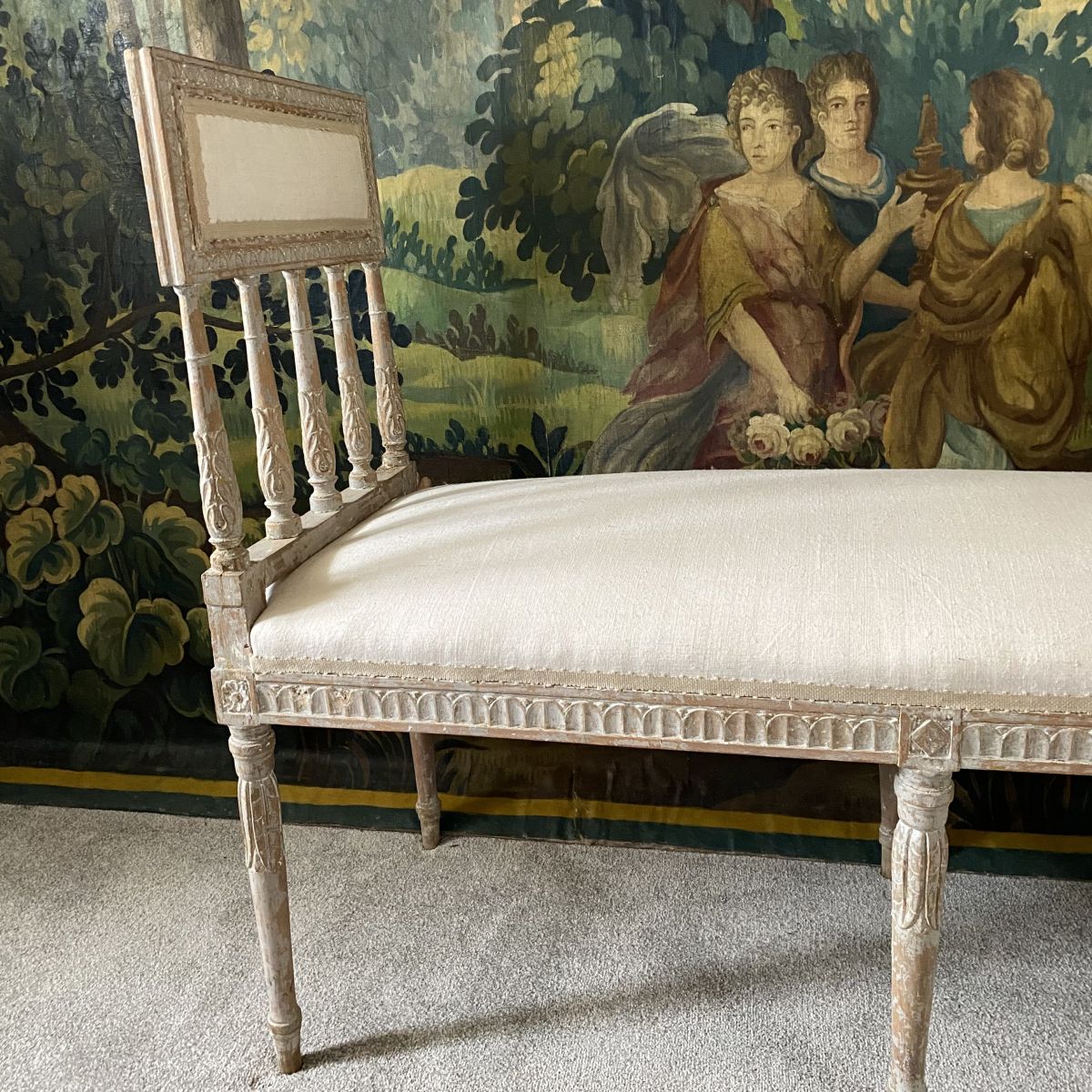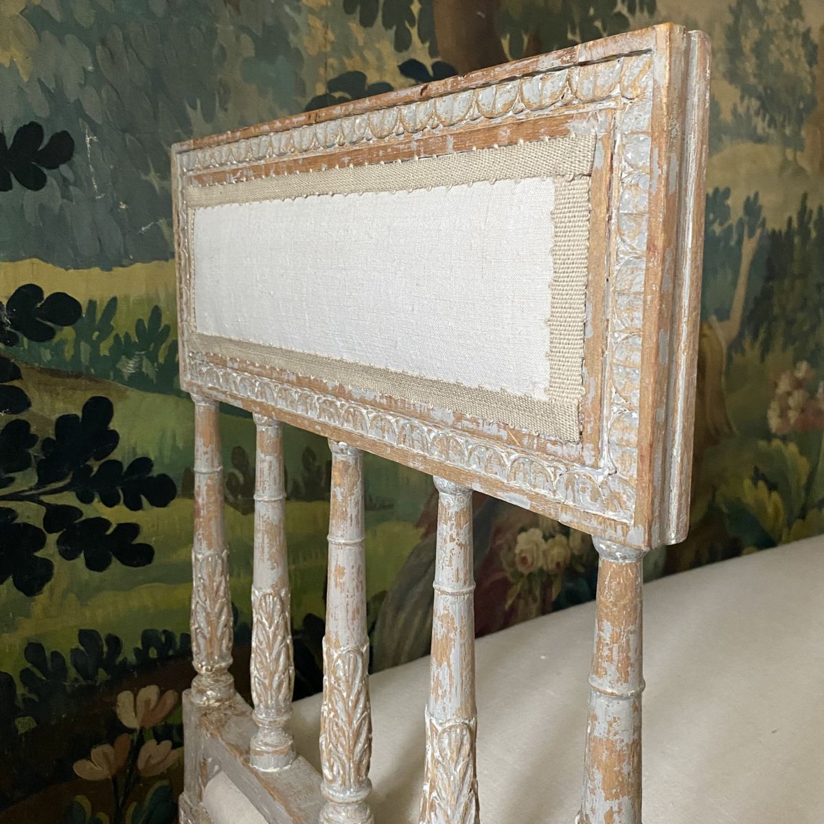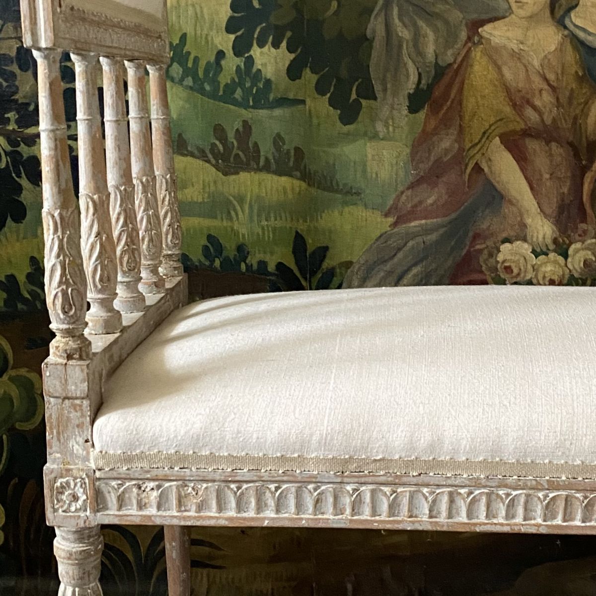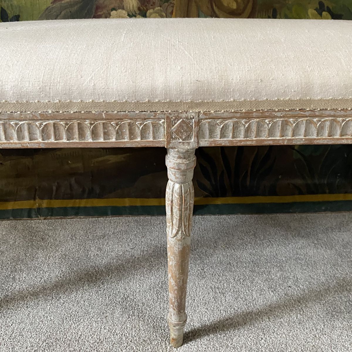 Early 19th century Swedish period Gustavian window seat / stool / bench - a beautiful example with fine hand carved details all in original paint with a palest grey blue tinge - seat recovered in neutral fine antique linen