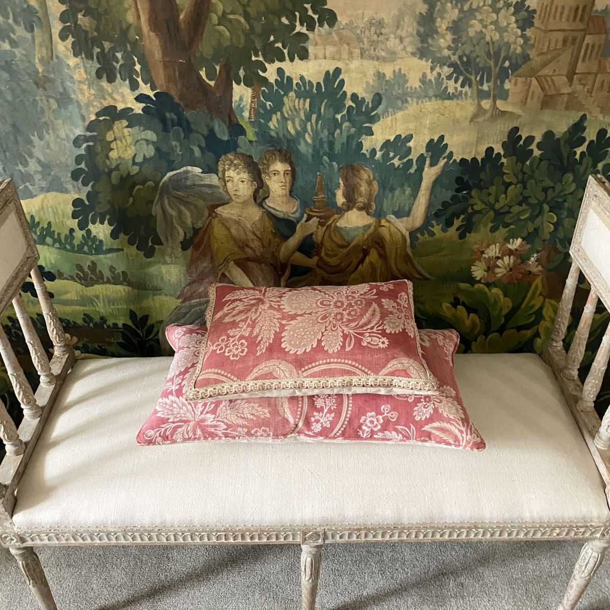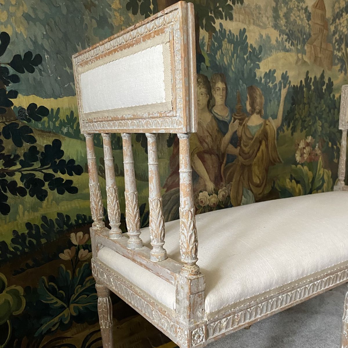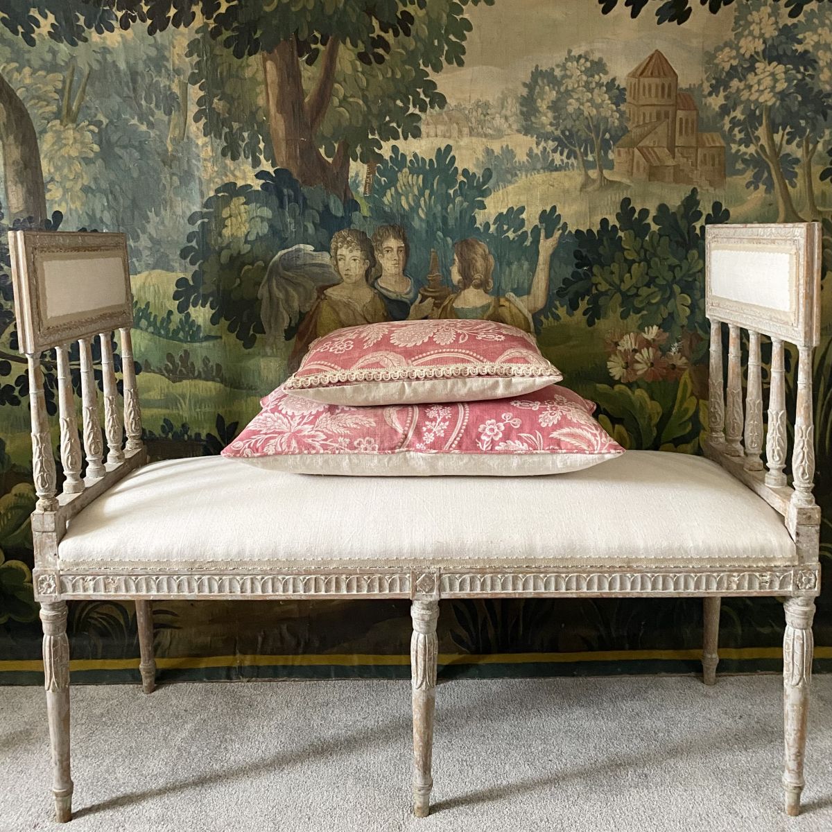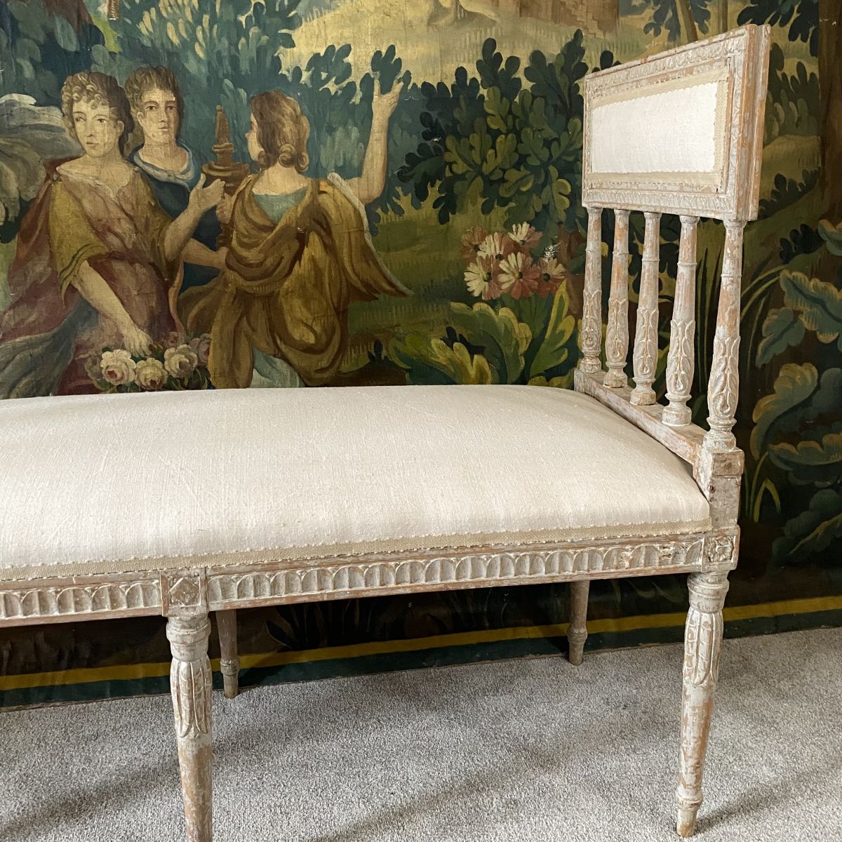 Early 19th century Swedish period Gustavian window seat / stool / bench - a beautiful example with fine hand carved details all in original paint with a palest grey blue tinge - seat recovered in neutral fine antique linen