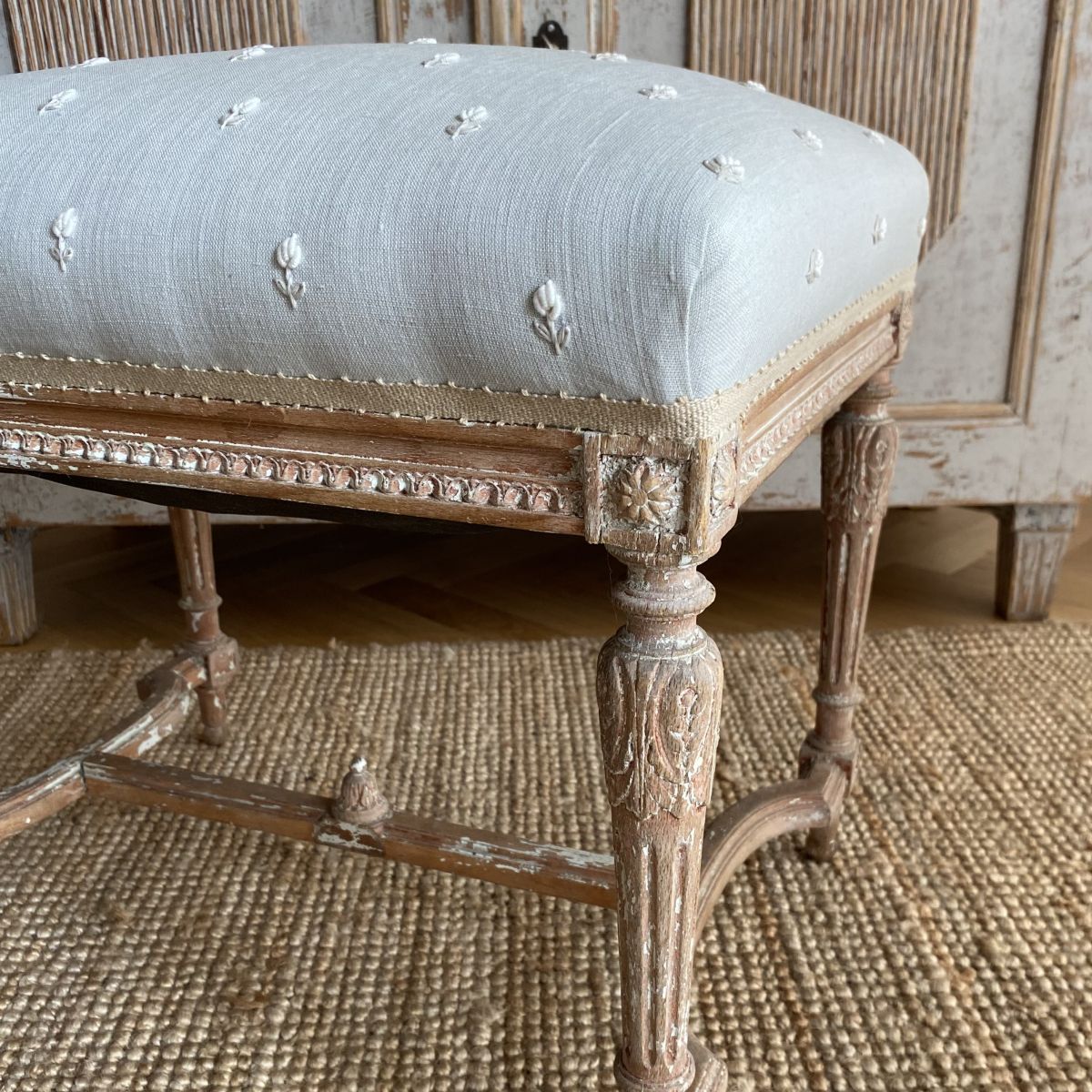 A large 19th century French stool with traces of original gilding reupholstered and covered in a hand embroidered linen (white and ecru flowers on a pale blue/grey background) strong and stable to use