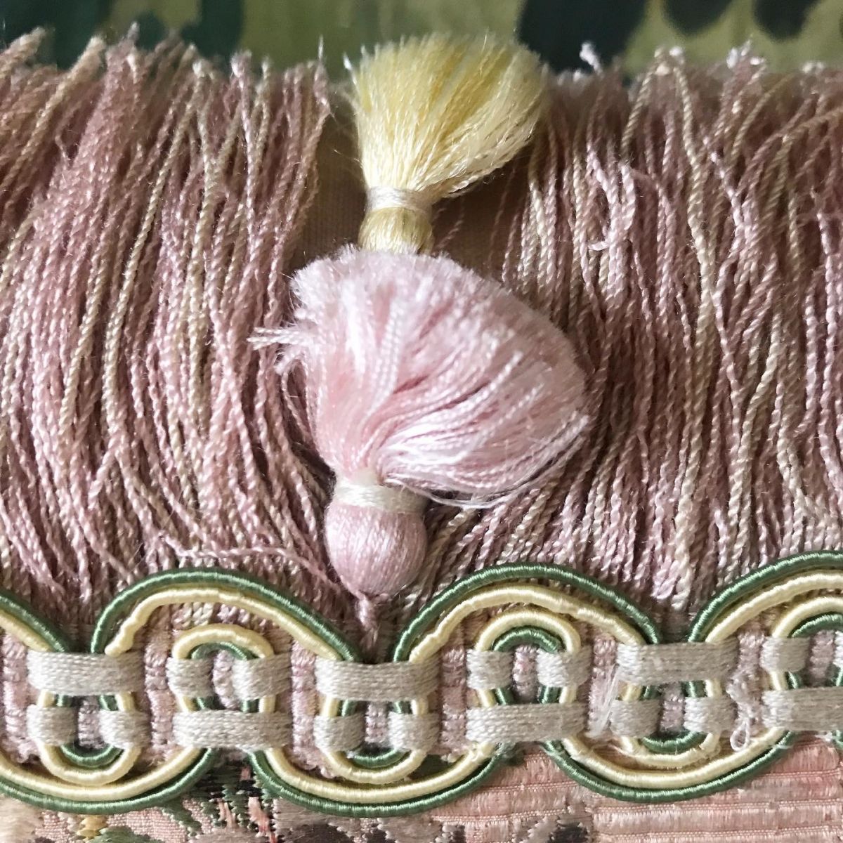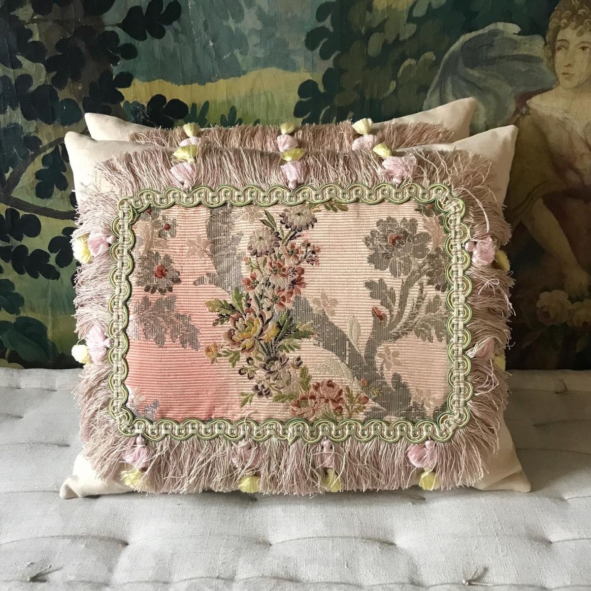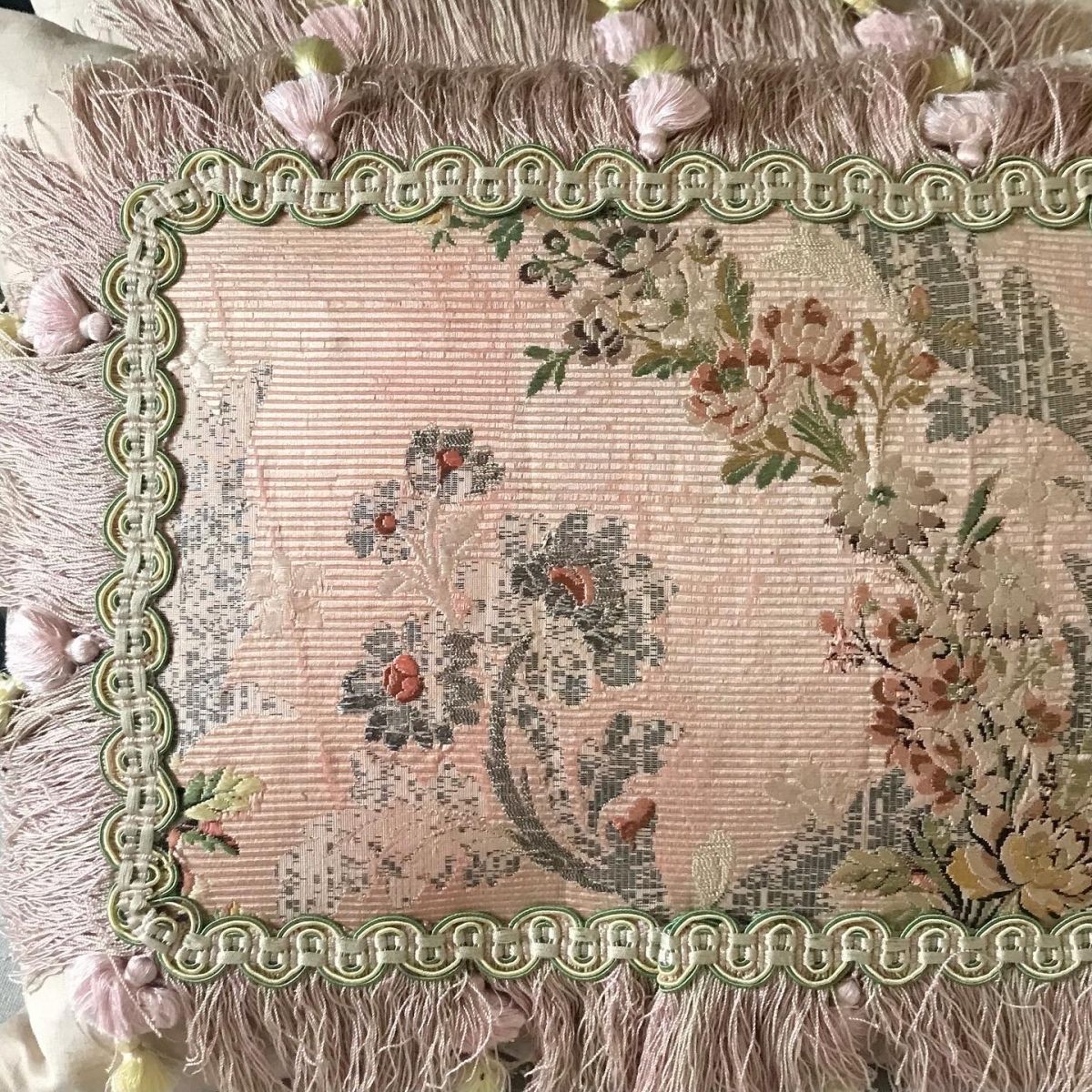 Beautiful cushions made from a large panel of exquisite Spitalfields silver thread silk brocade dating to circa 1800 then trimmed with a deep silk tassel fringe all placed on antique silk with matching antique silk to reverse - hand stitched to bottom with soft feather inner pads - textiles are all laundered and in excellent condition but given the early age of the silk these should be considered as dress cushions not for everyday sitting on