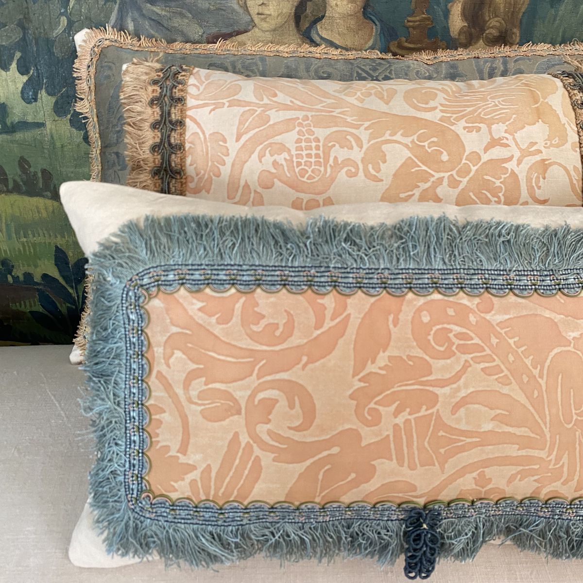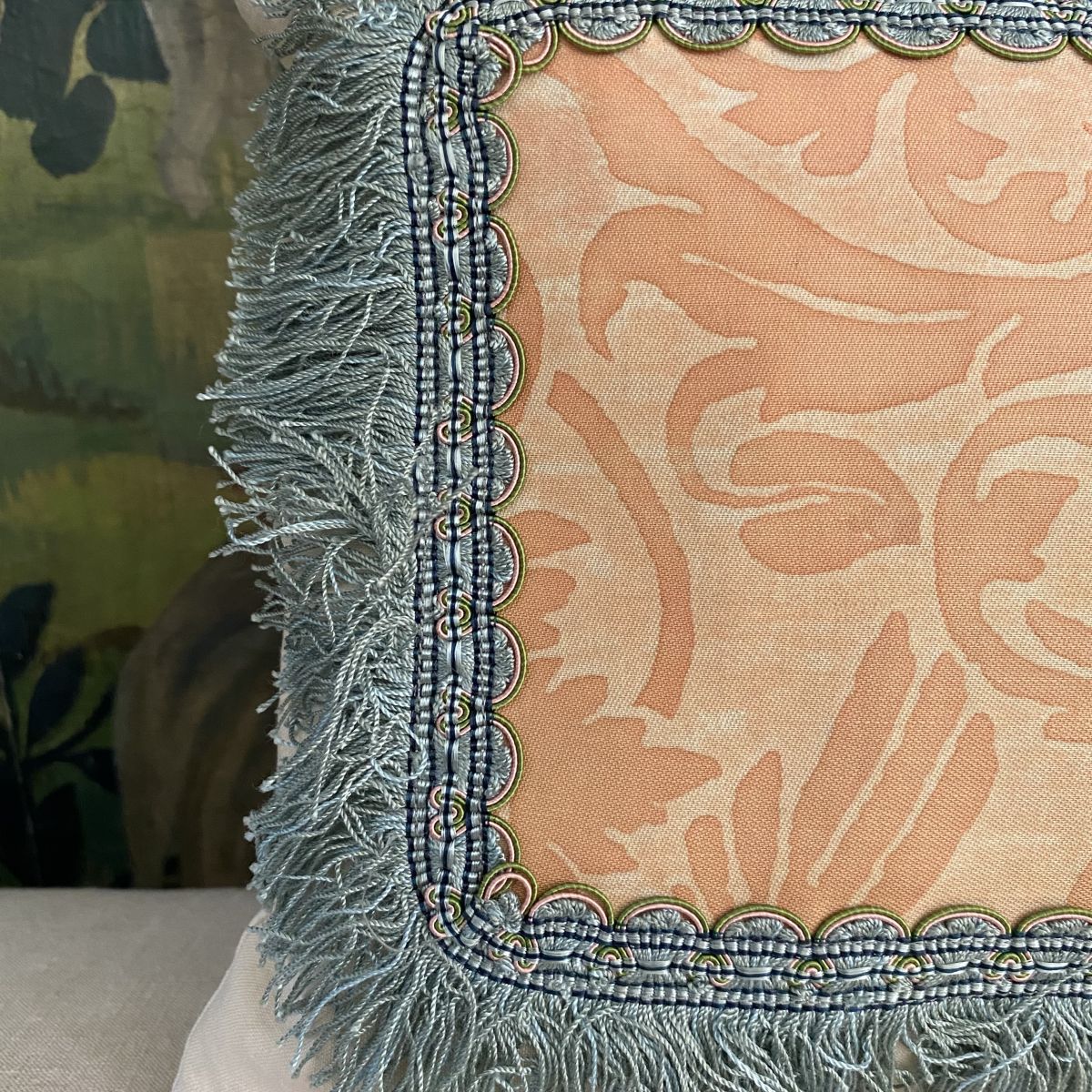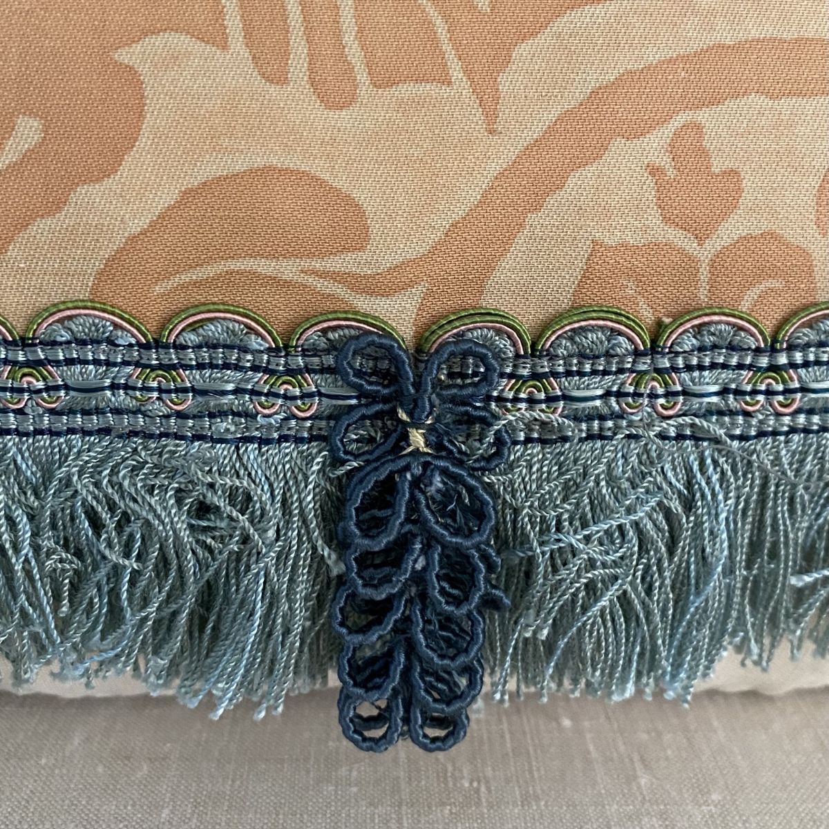 A panel of Fortuny Uccelli pattern in Melon edged with a blue vintage silk fringe on antique linen