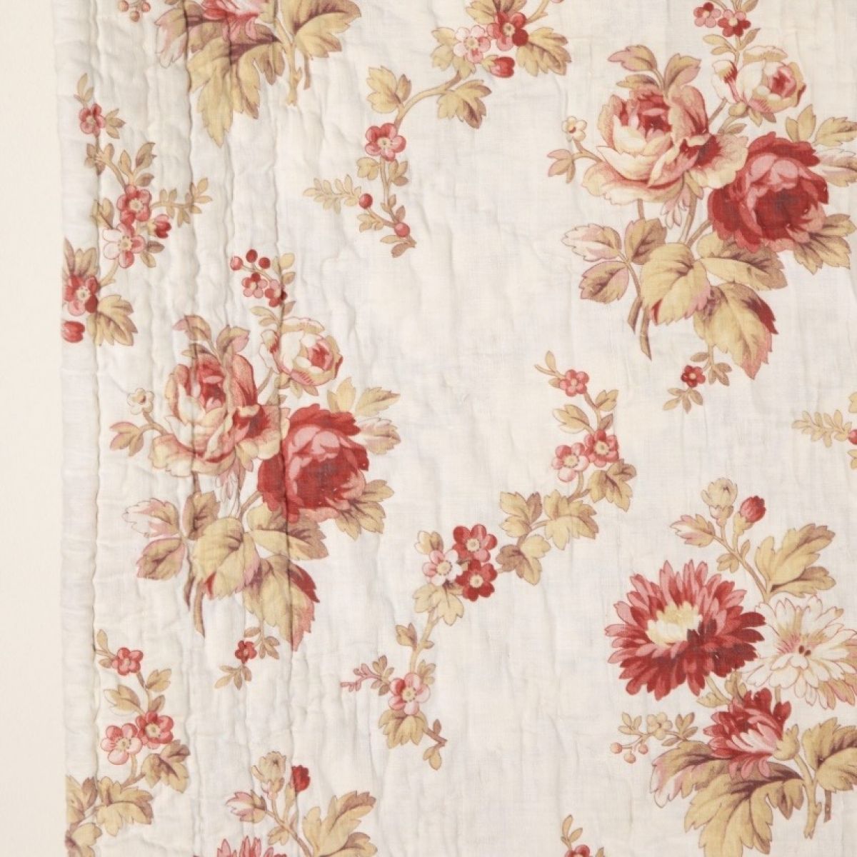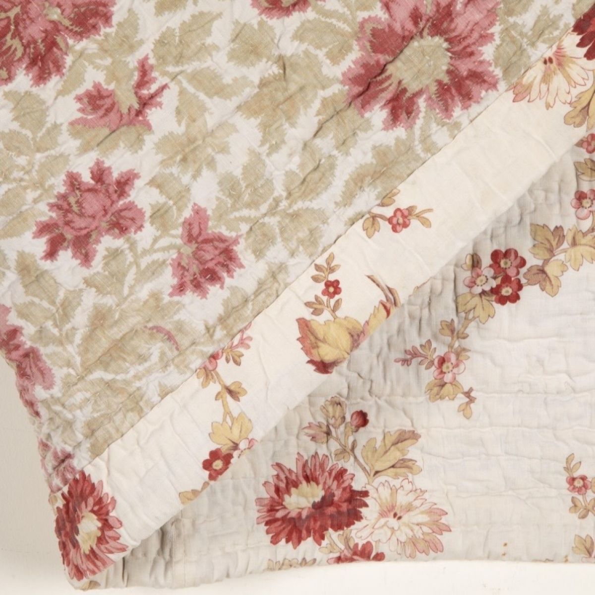 Pretty 19th century French hand stitched floral quilt with pink and raspberry roses on a pale cream background in good condition with a different pretty floral to reverse